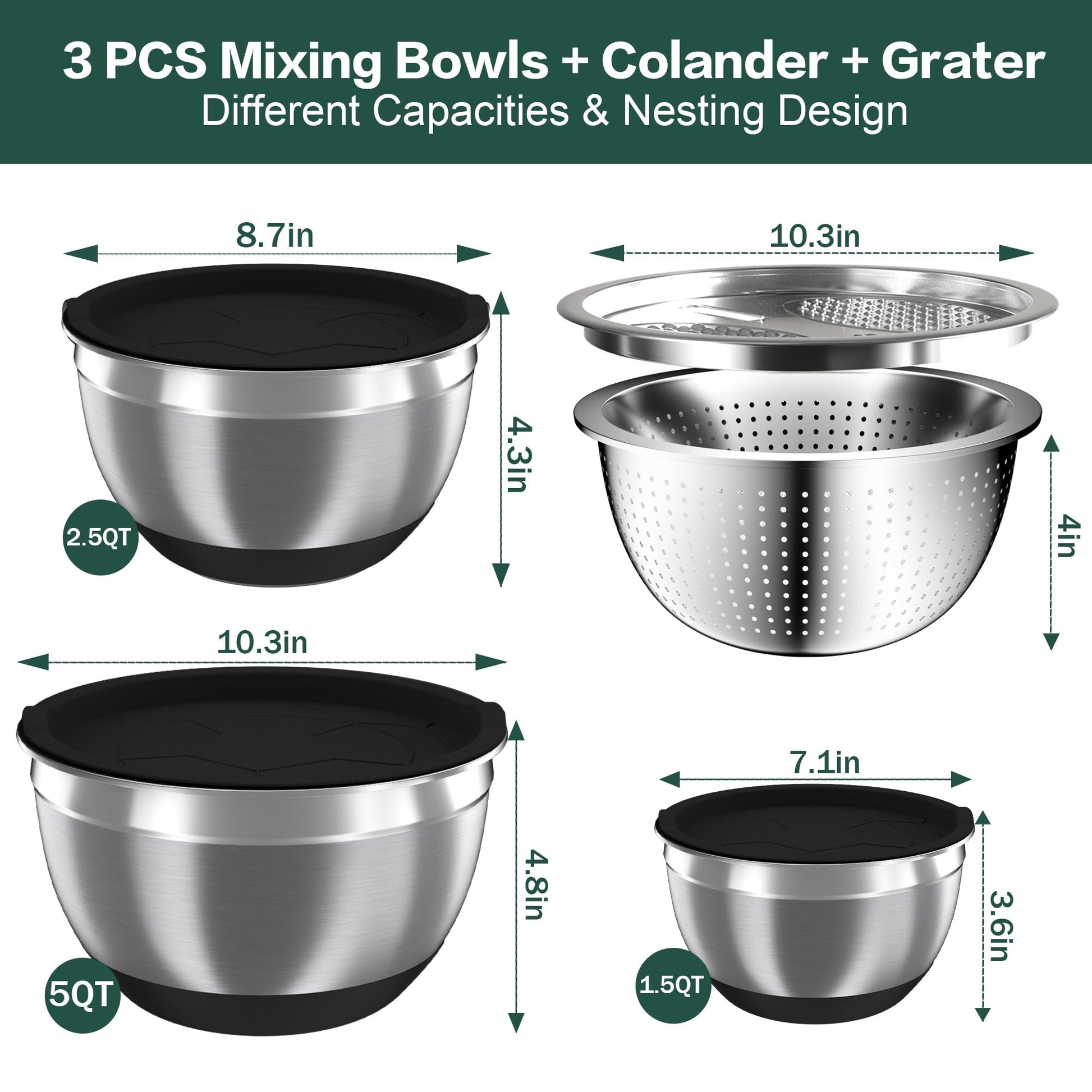 Mixing Bowls with Airtight Lids, Stainless Steel Mixing Bowl Set with 3 Metal Nesting Bowls, Colander & Grater, Non-Slip Bottoms, Size 1.5, 2.5, 5 QT, Great for Mixing & Serving, Black