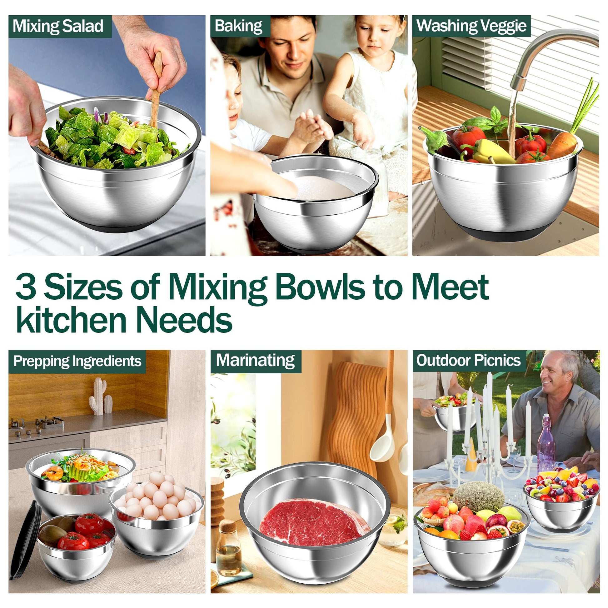 • 【Non-Slip Silicone Bottom & Multiple Sizes】: The mixing bowls stainless steel have a rubber bottom for grip and stability, preventing sliding on countertops and protecting surfaces from high temperatures. The mixing bowl set has 3 sizes (1.5, 2.5, 5 QT ), the metal mixing bowls are QT labeled for selection of the right size, and the bowls are sized to fit standard refrigerator racks and cabinets.