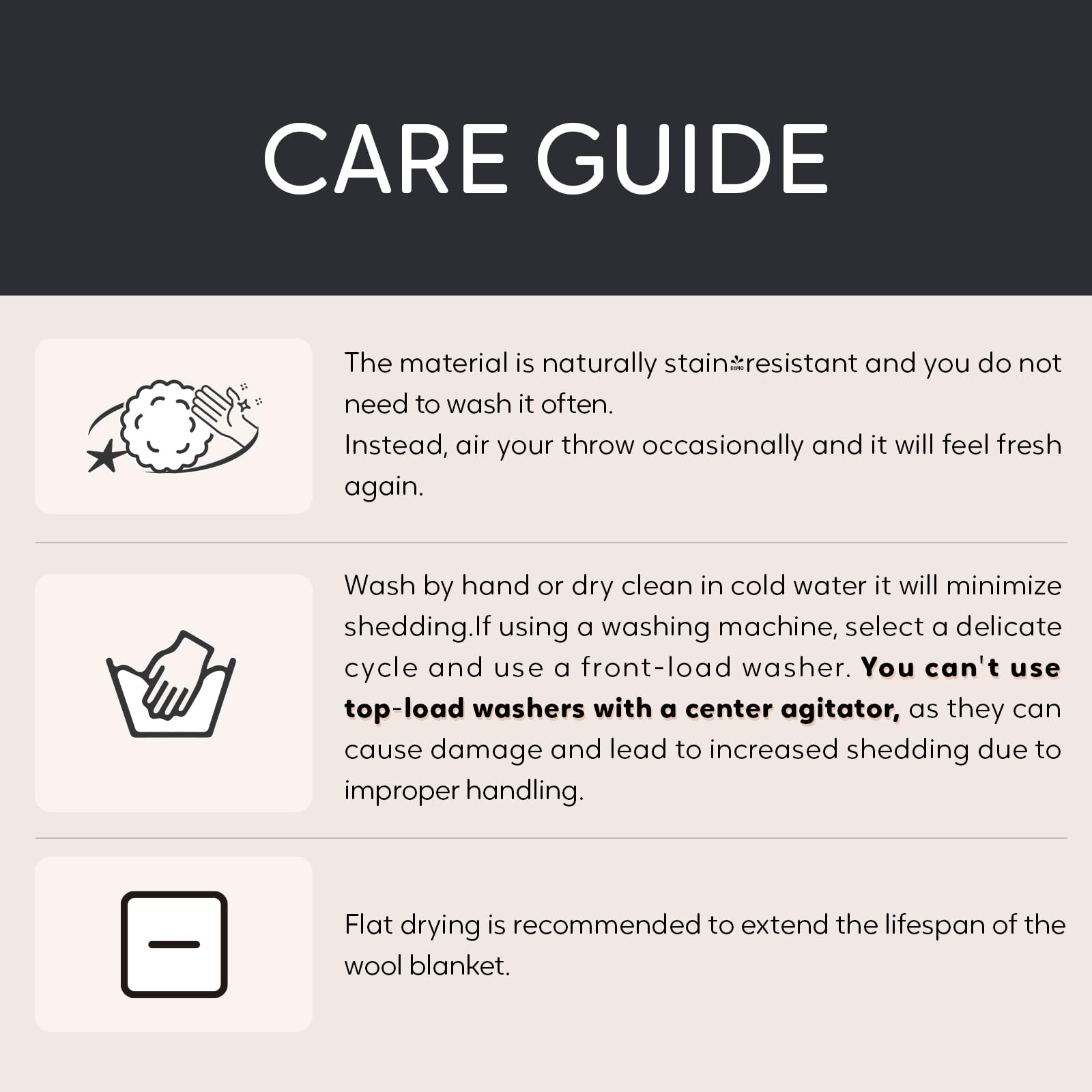 • EASY MAINTENANCE-Thanks to wool blanket, it has self-cleaning function, so it is usually washed once every one or two years.Instead, air your throw occasionally and it will feel fresh again. A little shedding is normal during the first wash, but if you can wash by hand or dry clean in cold water it will minimize shedding. In this way, the wool blanket can be protected and the service life of the wool blanket can be extended, and it may also accompany your life directly.If using a washing machine, select a delicate cycle and use a front-load washer. You can't use the top-load washers with a center agitator, as they can cause damage and lead to increased shedding due to improper handling.