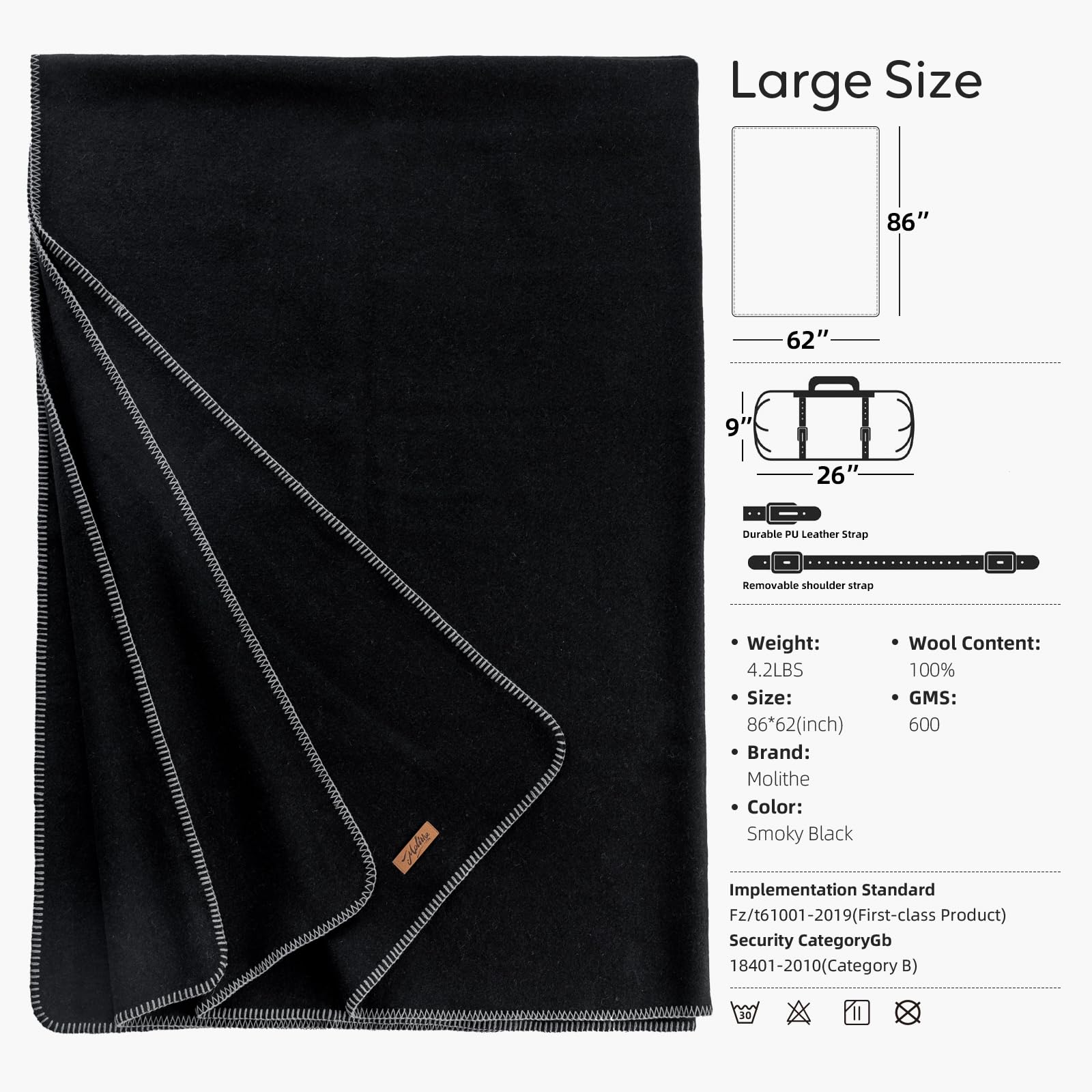 Molithe 100% Wool Blanket, 62" x 86", Warm, Thick, Washable, Military Wool Blanket, Great for Camping, Outdoors, Sporting Events, Survival Kits,Carbon Black