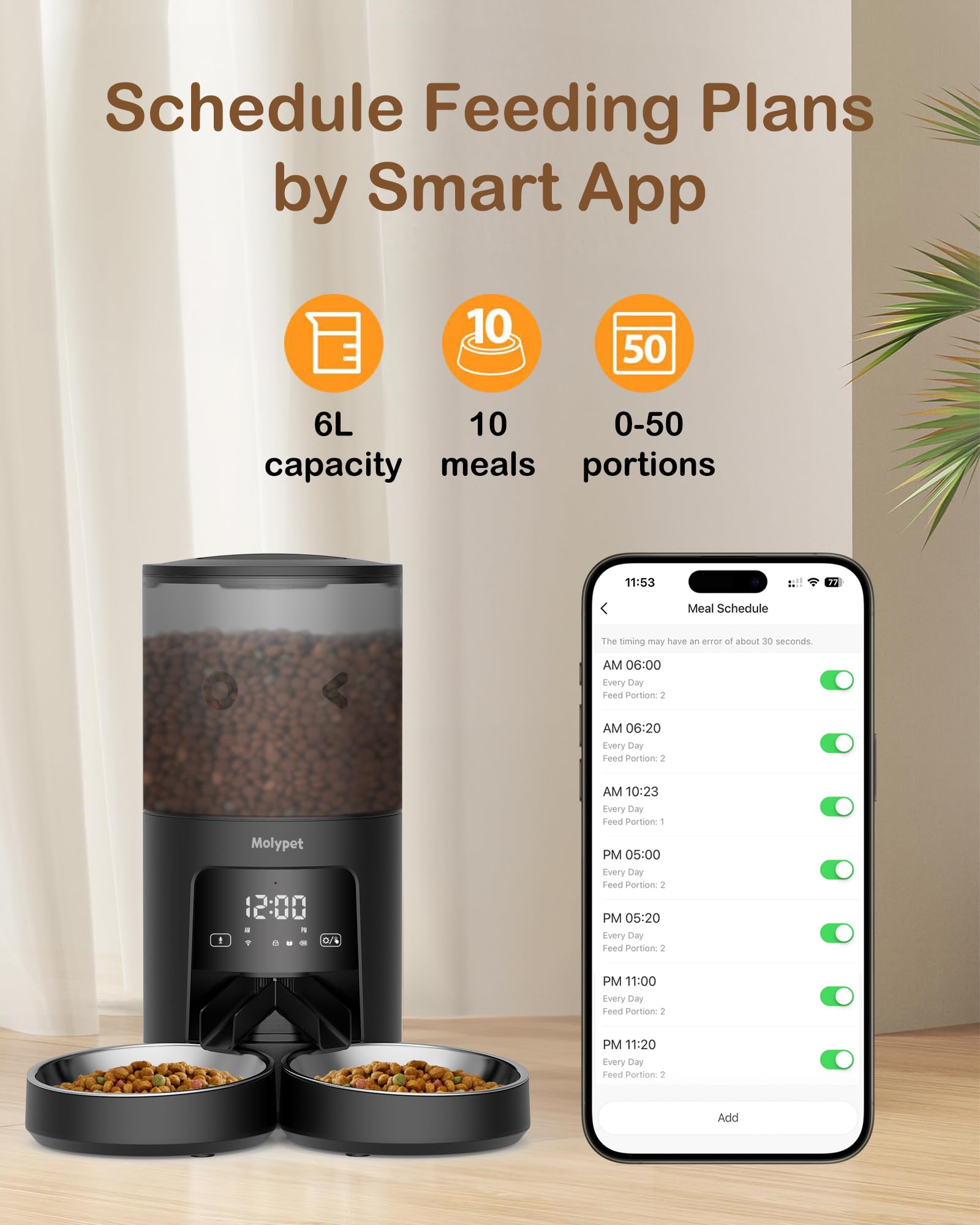 Molypet Automatic Cat Feeder 2 Cats - 5G WiFi Pet Feeder with APP Control, 6L Dry Food Dog Feeder with Blockage Alarms, 1-10 Meals Per Day