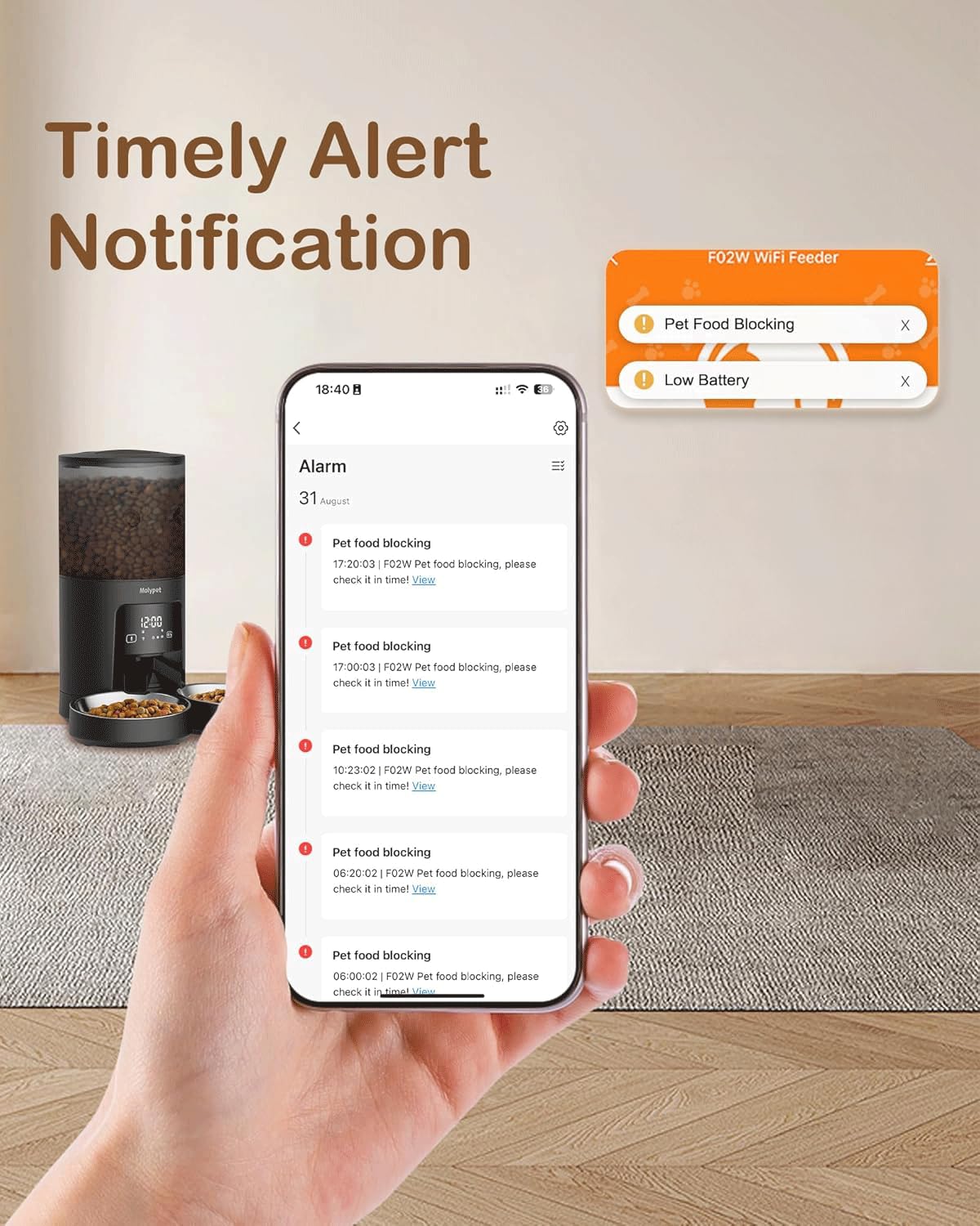 • Smart Alarm Notification: When the wifi cat feeder is blocked, short of food, empty of food or low battery, you will receive an alarm on your APP in time.The infrared sensor keeps checking and stops food dispensing if the food outlet is blocked