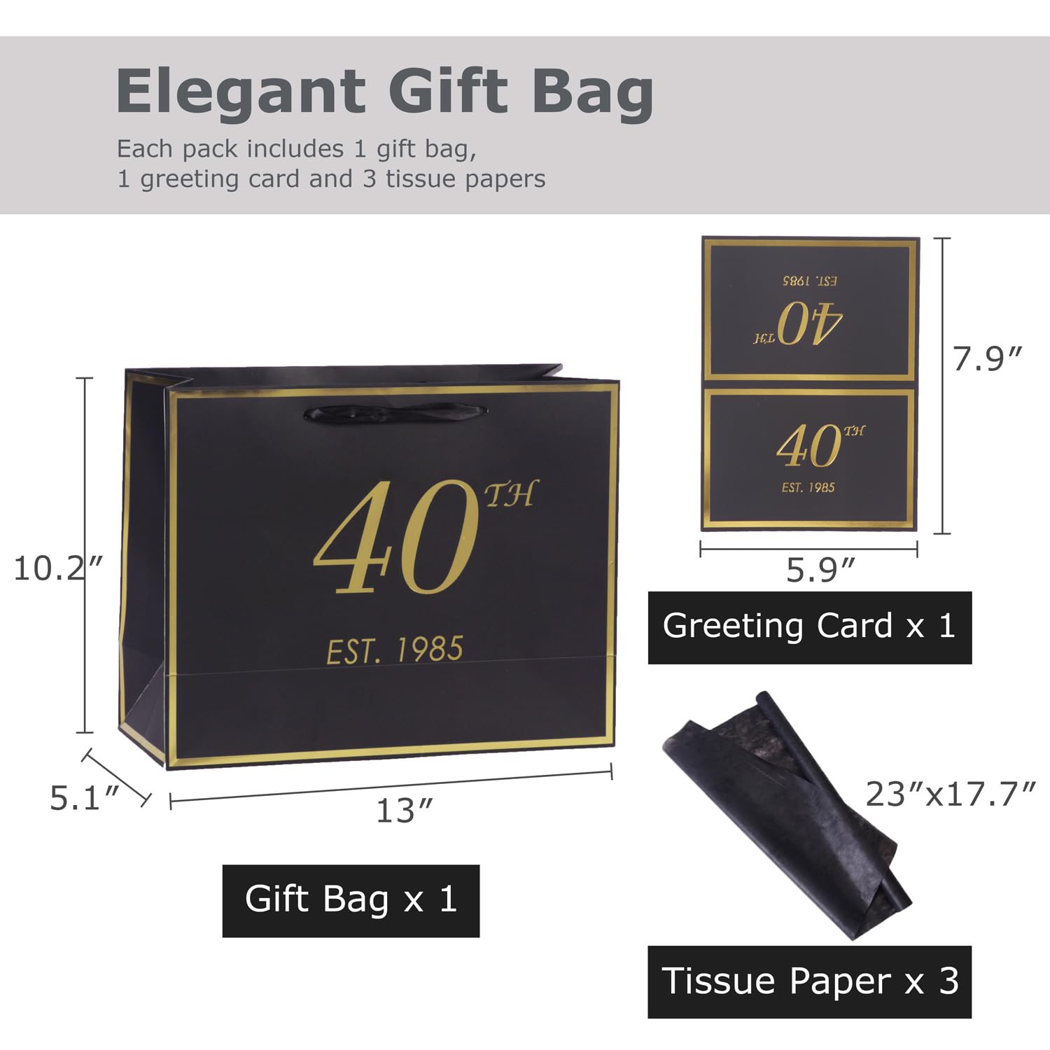 Details: 40th Birthday Gift Bag with Card and Tissue Paper for Men Women, 1985 40 Year Old 13" Elegant Black Gold Anniversary Keepsake Party Present Shopping Paper Bags for Gifts Wrapping (1985 40th)