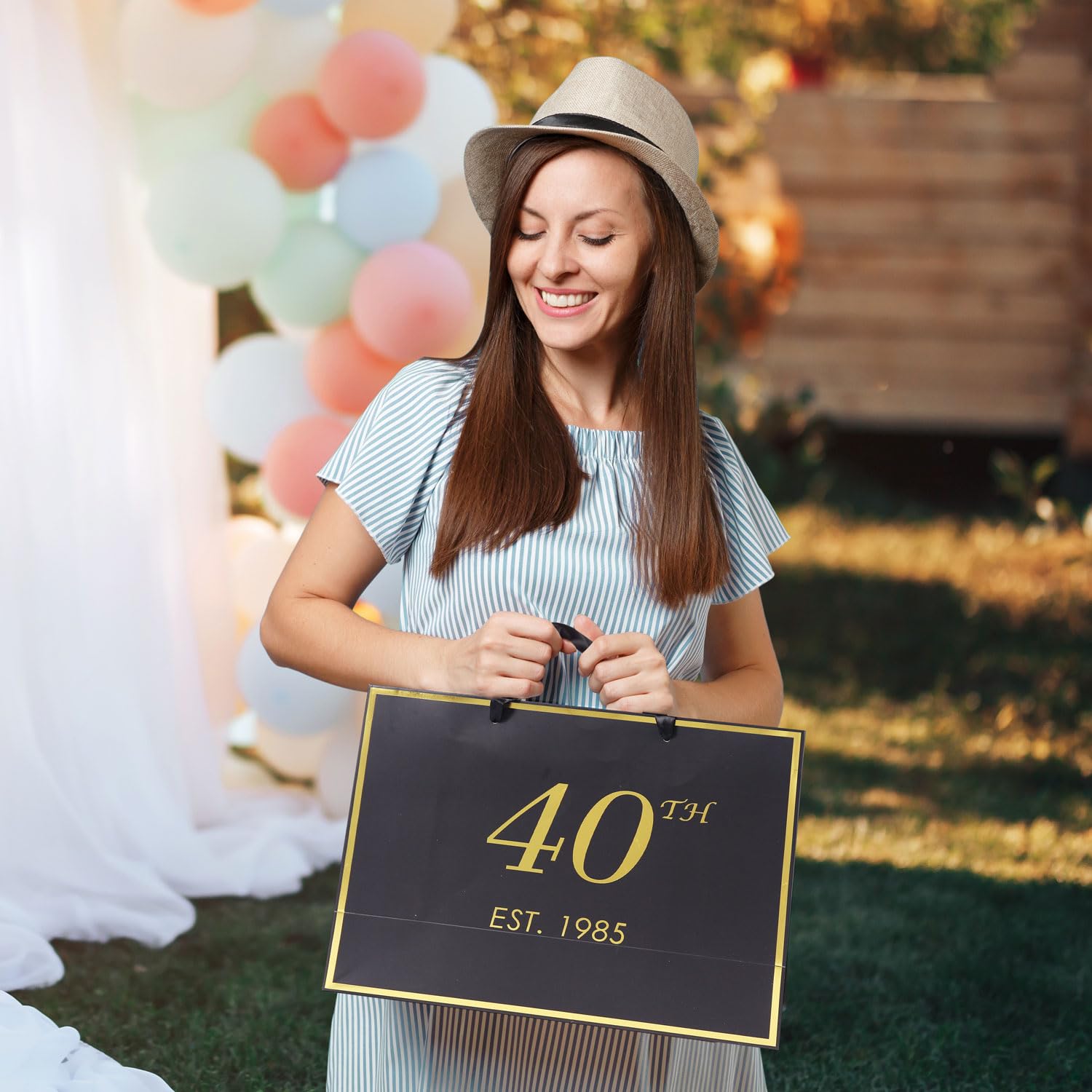 momoake 40th Birthday Gift Bag with Card and Tissue Paper for Men Women, 1985 40 Year Old 13" Elegant Black Gold Anniversary Keepsake Party Present Shopping Paper Bags for Gifts Wrapping (1985 40th)