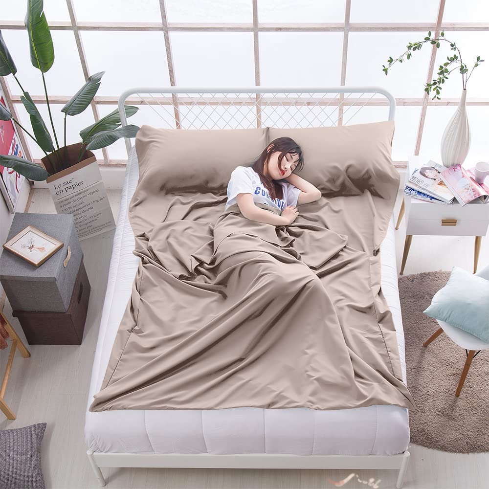 MongByYa Sleeping Bag Liner Lightweight Compact Sleeping Bag Sack Portable Clean Travel Sheet Camping Sleep Sheet for Backpacking Hotel Hiking (Light Khaki, 82.7” X 70.9”)