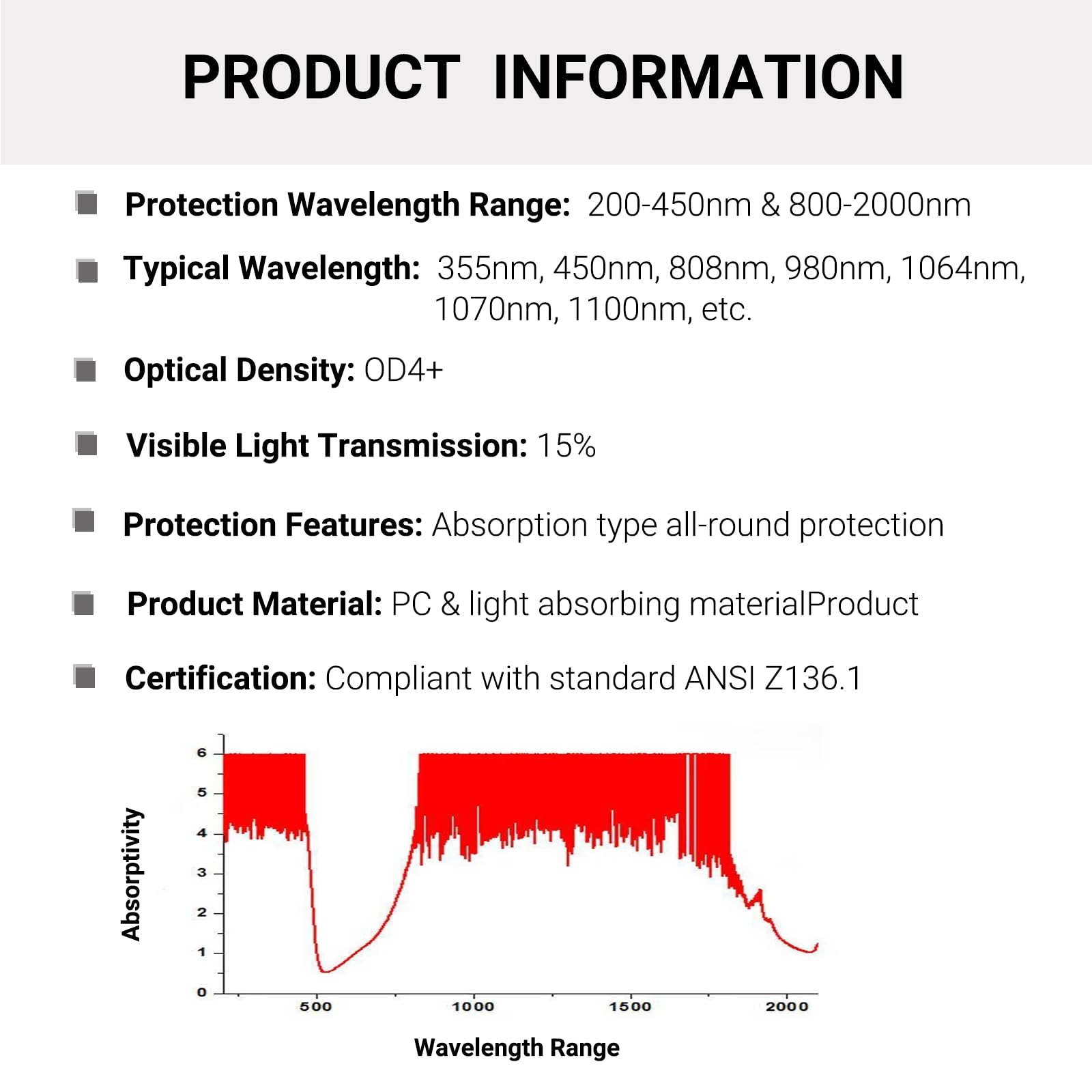 • 1.Protectable laser wavelength range: 200-450&800-2000nm,OD4+,15% Visible Light Transmission;broad spectrum protection, block UV, Blue, Red and Infrared Pulsed Laser light.