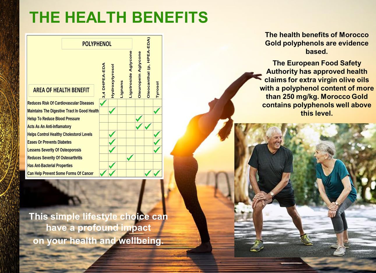 • Morocco Gold is an exceptional extra virgin olive oil sourced from the Beni-Mellal region of Morocco, produced exclusively from Picholine olives. These olives are known for their high polyphenol content, which contributes to the oil's stability, distinct fruity taste, and health benefits.