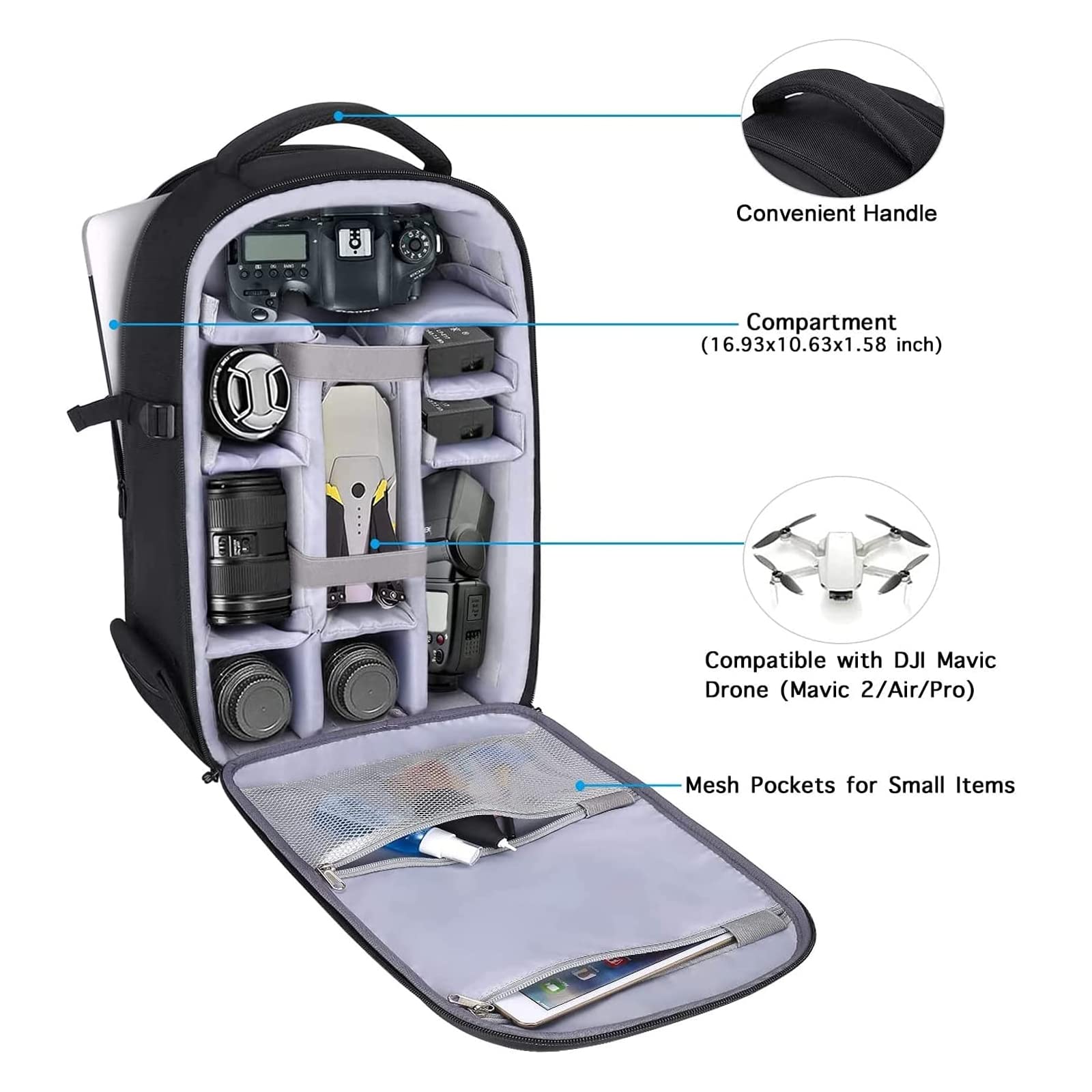 • This multifunctional camera bag is professionally designed for DSLR / SLR / Mirrorless cameras of different brands. Compatible with Nikon D5600, D5300, D3500, D3400, D3300, D3200; compatible with Canon EOS Rebel T6, T6i, SL2 and other standard-size DSLRs. Also designed to be compatible with DJI Mavic Drone(Mavic 2/Air/Pro).