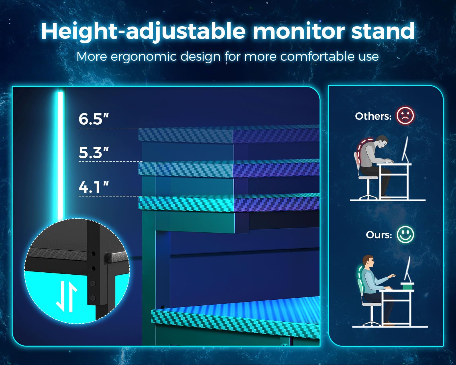 • 4+ Install Methods with Adjustable Monitor Stand & Shelf: This computer desk has multiple mounting options to fit more spaces better. The monitor stand supports three levels of height adjustment (4.1'-5.3'-6.5'), which better adapts to your eye level and takes care of the health of your neck. The adjustable shelf can be great for organizing your items and keeping your desktop tidy.