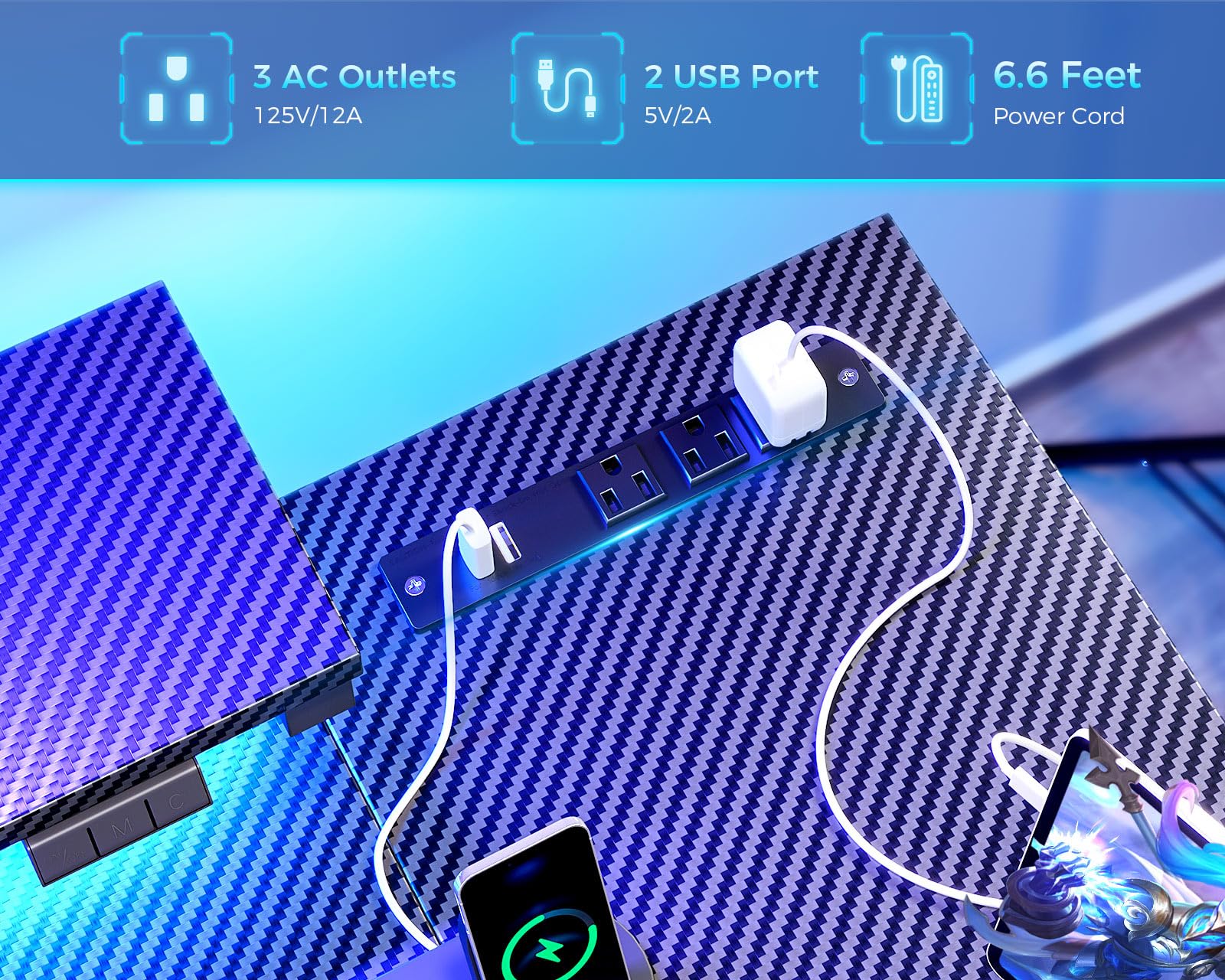 • Power Outlets & Colorful Led Strips Lights: This L-shaped desk has a built-in power outlet with 3 sockets & 2 USB Ports, which can charge your device more conveniently. High-quality LED strips with the controller not only create a great atmosphere for gaming but also serve as a handy night light.