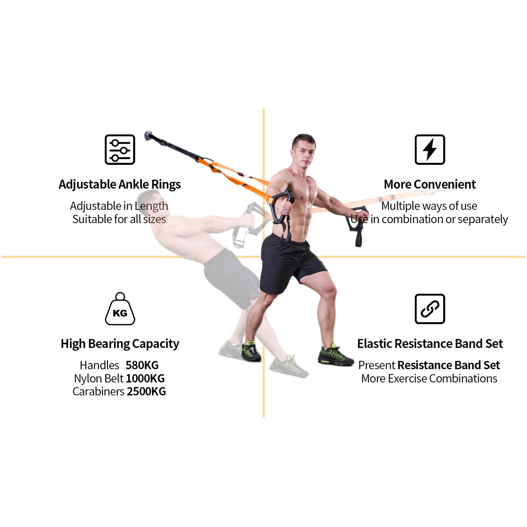 • SET INCLUDED:2 x Adjustable Resistance Training Straps,1 x Door Anchor,1 x Extension Strap,1 Sports Training Guide