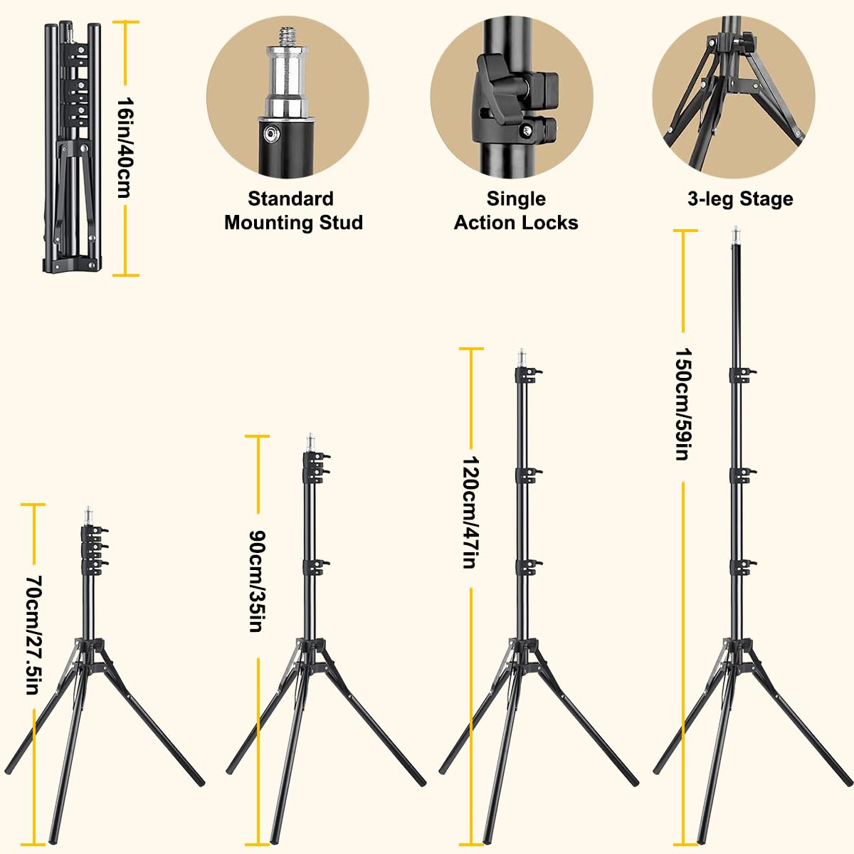 • Reverse Folding Tripod - The photography lighting stand is made of high-quality aluminum alloy and features a tripod with an independent locking knob. It has the characteristic of reverse folding, greatly reducing space occupation. A stretchable bracket with an adjustable range of 16-59 inches provides sufficient stability for your softbox and optional height for photography.