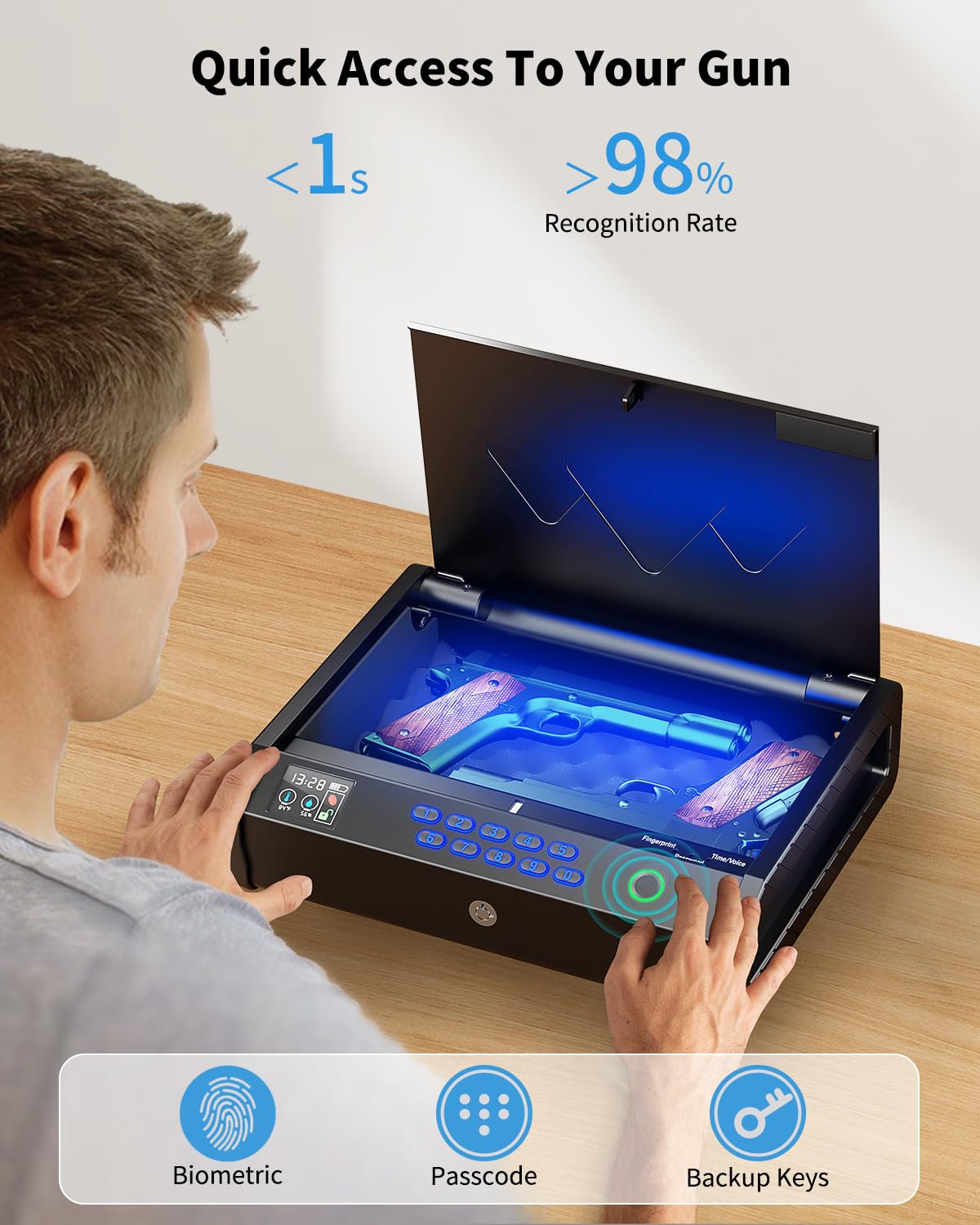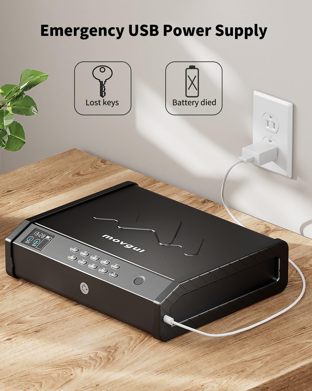 movgul Gun Safes, Biometric Pistol Safe with LCD Display of Temperature Humidity USB Port, Gun Safes 3 Ways Quick Access Fingerprint Handgun Safe for Nightstand Car