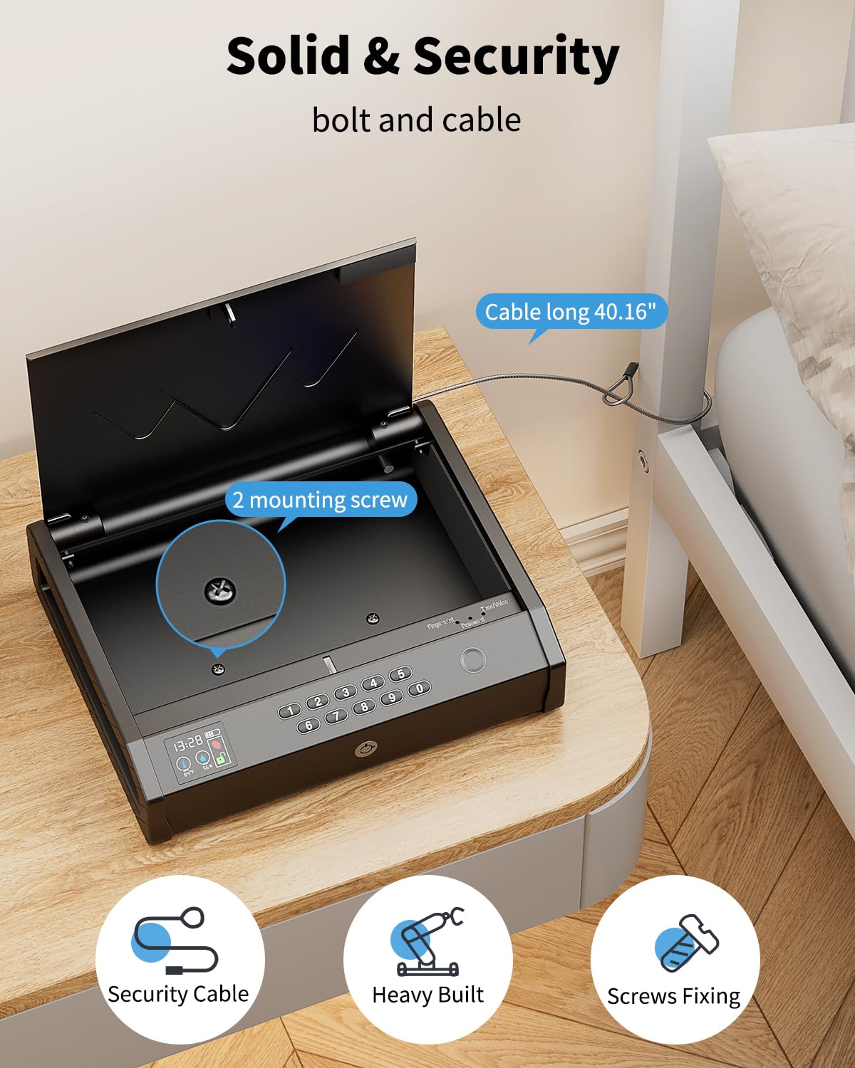 • Bolt & Cable: The biometric gun safe for handgun include 40.16" steel security cable allows you to anchor the safe to any fixed object. For added convenience, the handgun safes come with two screws that enable easy mounting on a table or inside a drawer.