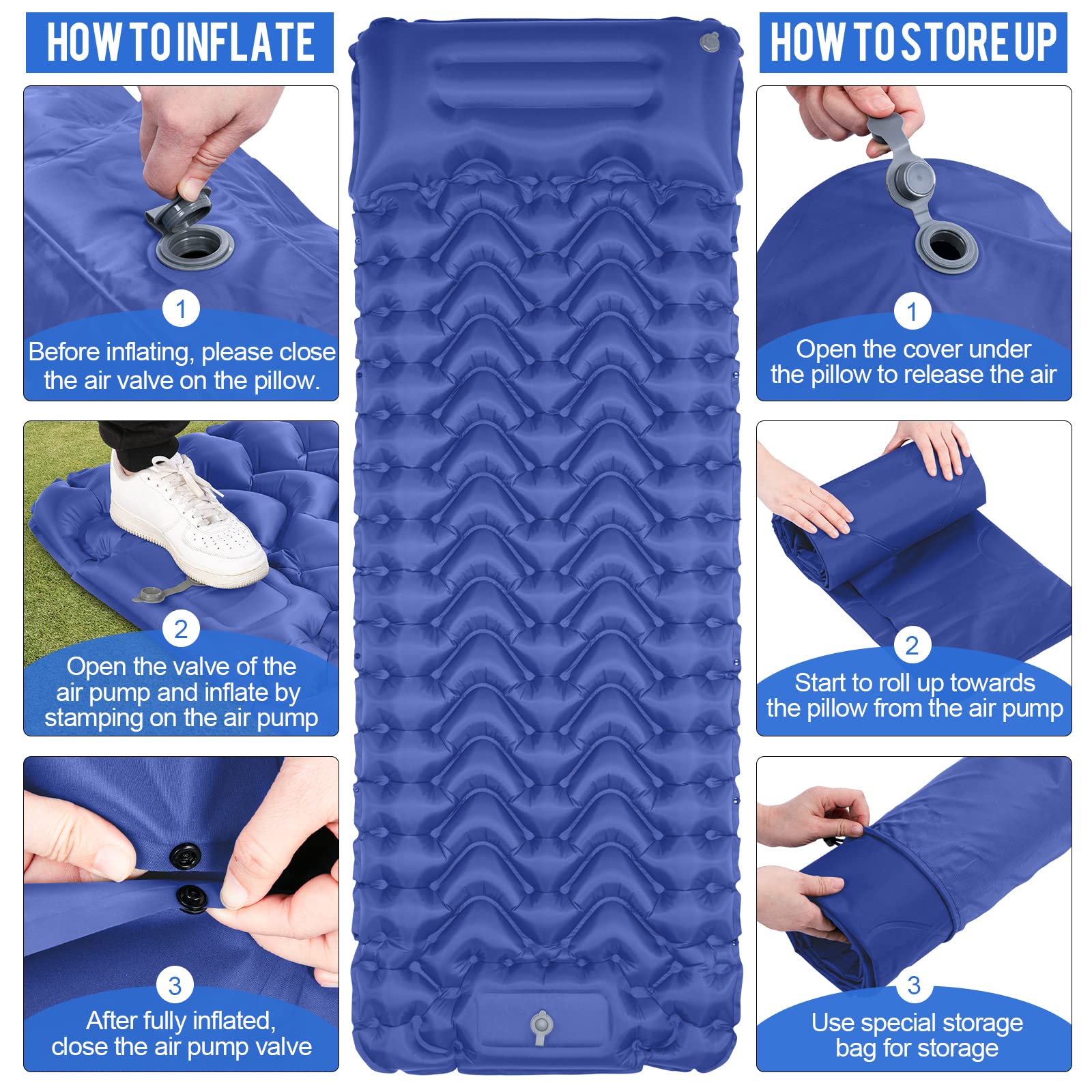 • 【Foot Press to Inflate-Only 20s Needed】 There is no need to inflate with your hands, mouth, or a pump for our camping sleeping pad. It just only takes 20s after you inflate the sleeping mat fully by stamping the spot of the built-in pump with your foot.With anti-leakage films in the valves, you would never worry about air leaking when using it! Besides, super quick to deflate - take out the deflation plug.It's time to plan a camping and hiking with our innovative camping sleeping pad now!