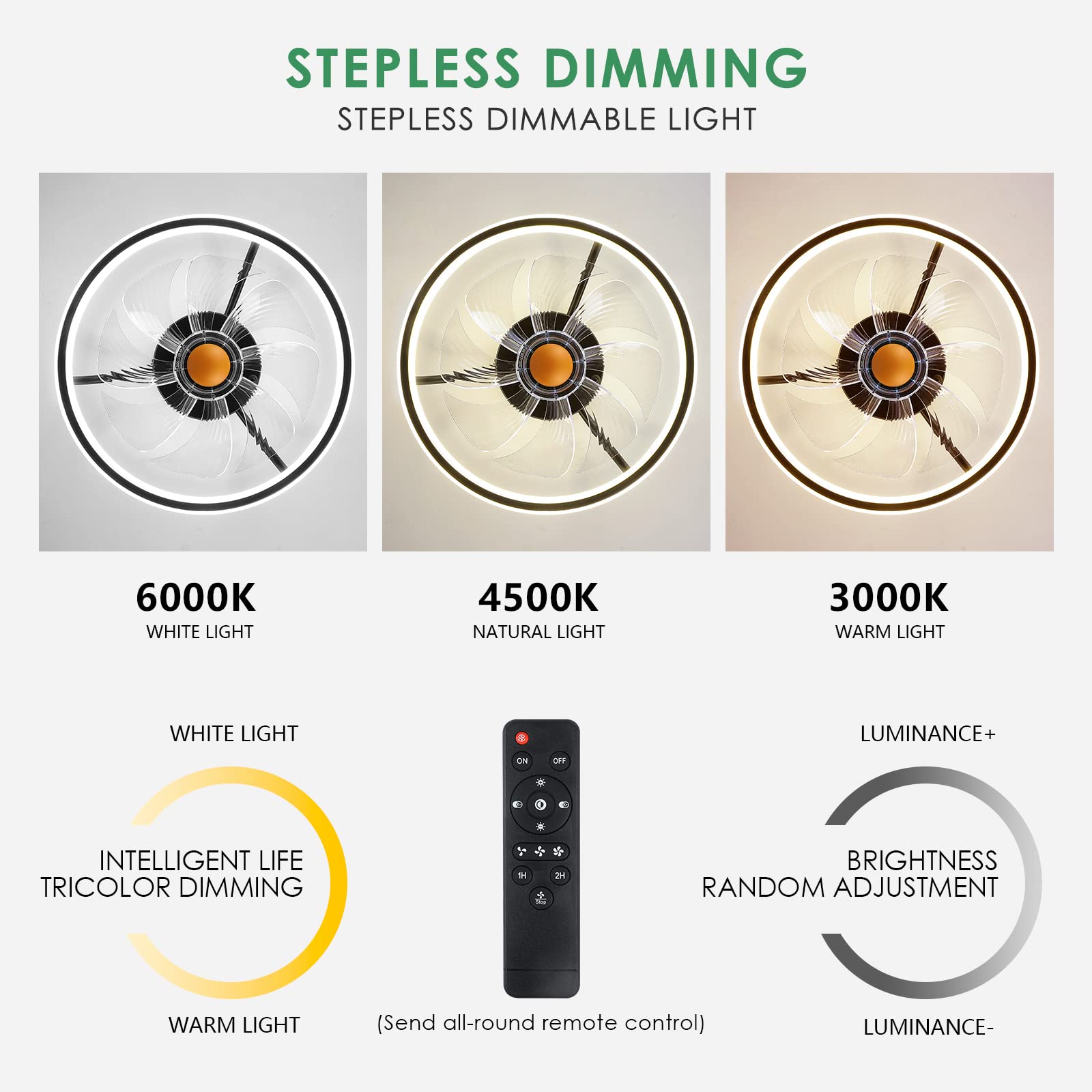 • ⭐【FLUSH MOUNT CEILING FAN】: The Low Profile Bladeless ceiling fan with light adopts 110V 100% Pure Copper motor and stepless dimming. There is no noise after the fan is turned on. Remote control the fan and light, and have a timing function to turn off the fan automatically after you fall asleep, ensure safety and save energy.