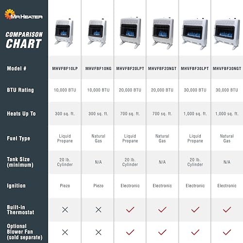 Details: Mr. Heater 30,000 BTU Vent Free Blue Flame Propane Heater is the ultimate solution for reliable heating in any indoor space, even during the coldest days. Designed to efficiently heat spaces up to 1,000 square feet, this propane heater uses blue flame burner technology to provide consistent convection heat that circulates warm air evenly throughout the room. Whether you’re trying to warm up your sunroom, cabin, garage or an addition, this unit is perfect for keeping you cozy and comfortable. The heater comes with a built-in thermostat, allowing you to control the temperature easily and precisely. This ensures your space stays at the perfect warmth level without the need for constant adjustments. With the battery-powered electronic ignition, getting the heater started is as simple as pressing a button (battery included). Installation is easy and versatile, as this heater can either be mounted on the wall or placed on the floor using the included legs and mounting hardware. This flexibility makes it a great fit for a wide range of spaces and setups. For even greater comfort, an optional Blower Fan Kit (F299201, sold separately) is available for 20,000 BTU units and higher, helping to enhance the distribution of heat. Safety is a top priority with our Blue Flame Vent Free Garage Heater. It features an Oxygen Depletion Sensor (ODS) that automatically shuts off the unit if the oxygen levels in the room drop to unsafe levels, providing peace of mind during use. This CSA-certified heater is ideal for cold rooms, additions, and other areas, but is not recommended for use in bathrooms, bedrooms, or recreational vehicles. Additionally, it should not be operated at altitudes over 4,500 feet, as this could cause the ODS to shut down the unit. Whether you need supplemental heat or a primary heat source for smaller spaces, the Mr. Heater Propane Heater offers a reliable, safe, and efficient solution for any indoor area. Note: This product is restricted in Canada and California.