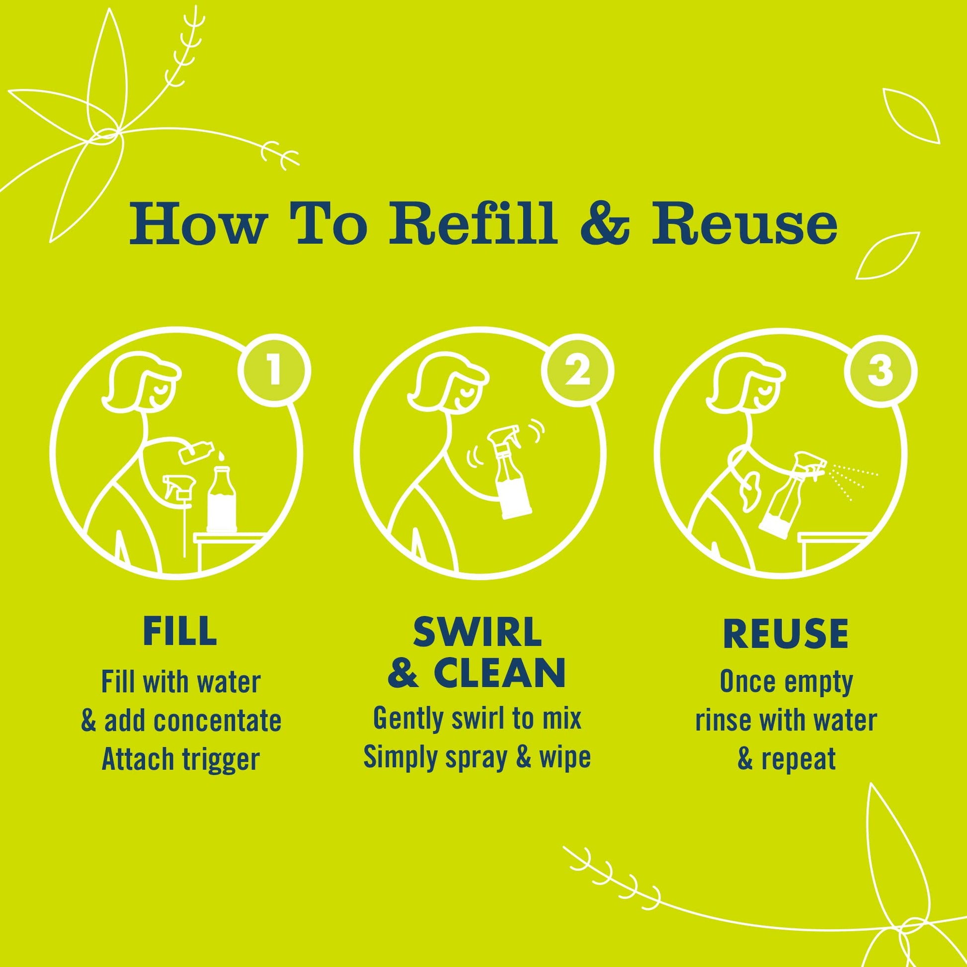 • Mrs. Meyer's 2 oz Concentrated Refill is equal to 1 full Multi-Surface Everyday Cleaner using our 16 oz reusable glass or plastic bottles