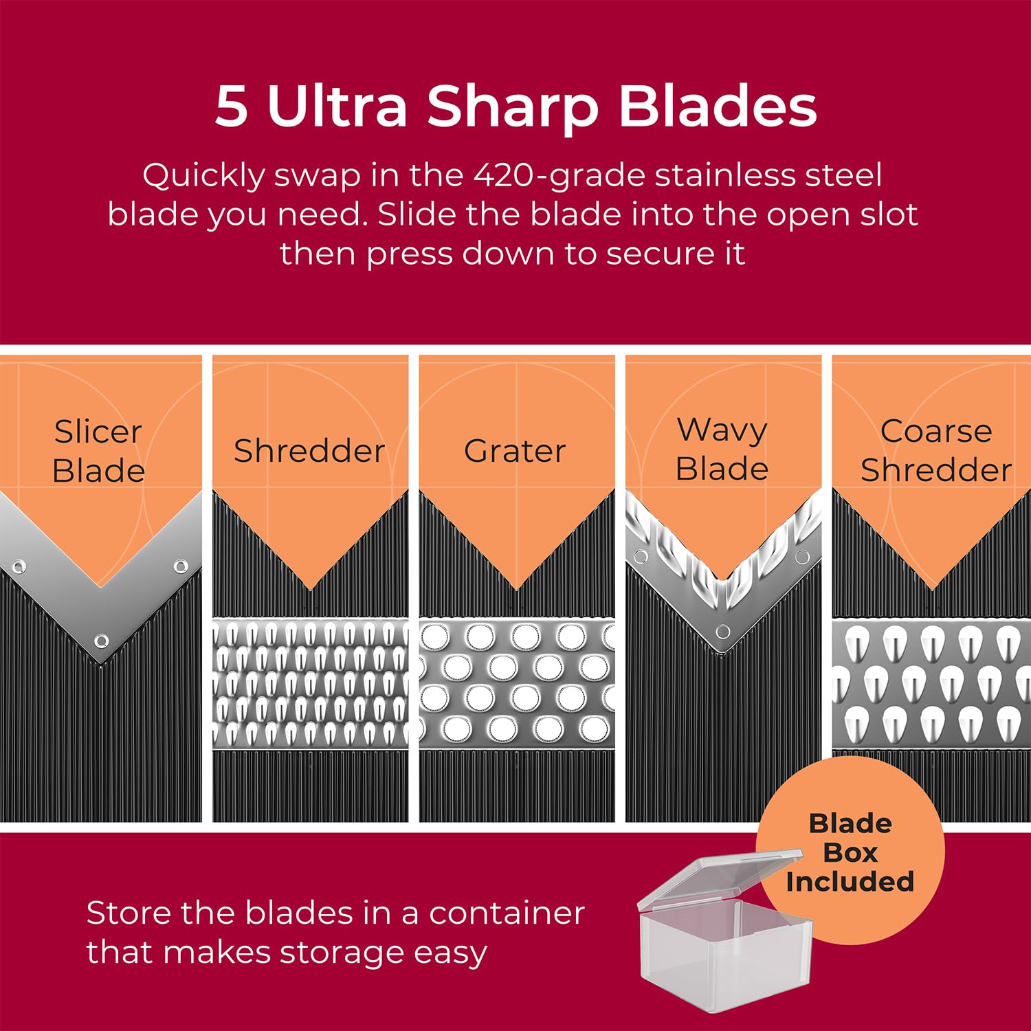 • Includes 5× Blades – Blades evenly cut onions, cucumbers, sweet potatoes, apples, and more. Use as a cheese slicer, grater and as a julienne shredder.