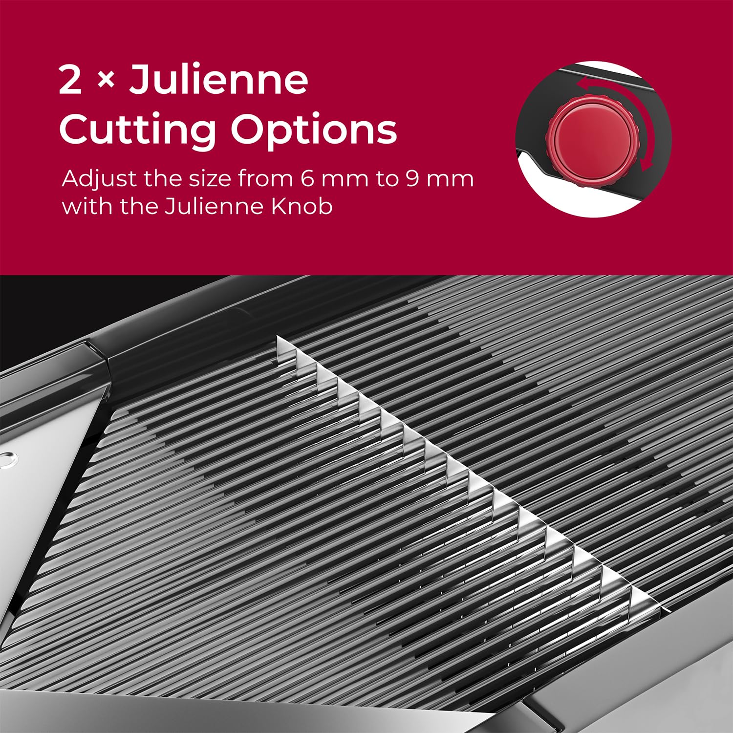 • Change Thickness – Changing blades and adjusting slice size is easy. Twist the knob dial for thickness (1-9 mm) or julienne size (6 mm to 9 mm). Top-rack dishwasher safe.