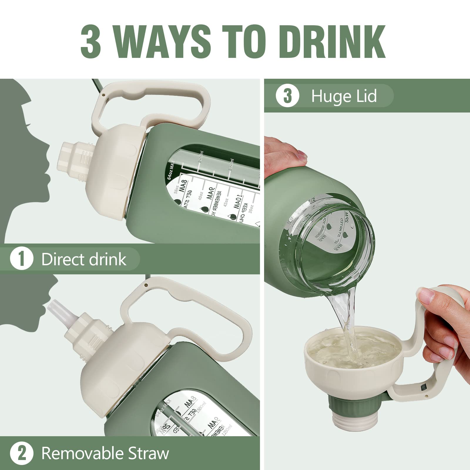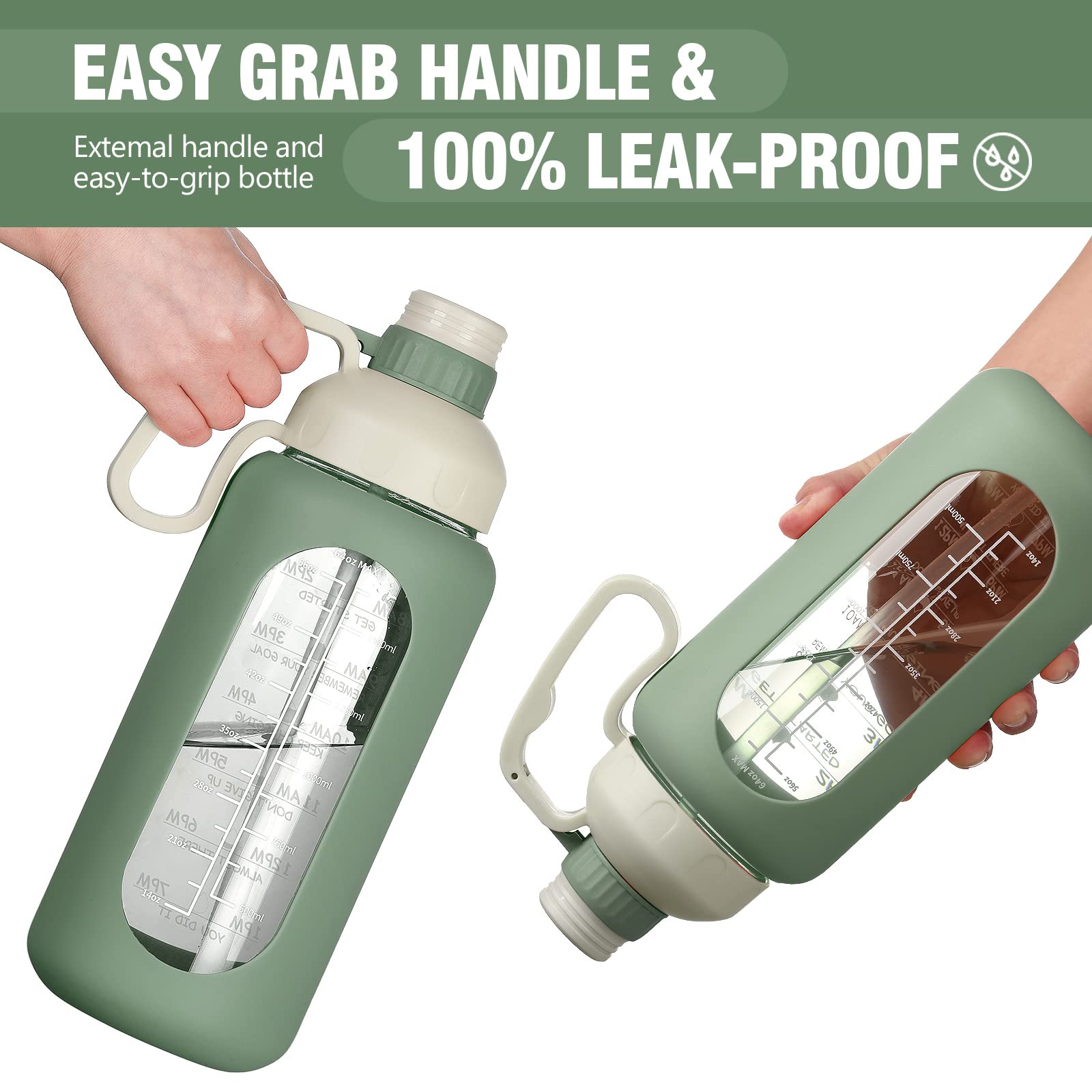 MUKOKO 64oz Glass Water Bottles with Straw, Half Gallon Water Jug with Time Marker, Sports Large Motivational Bottle with Silicone Sleeve, Olive