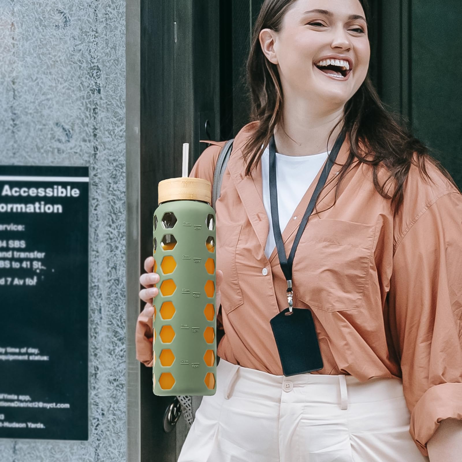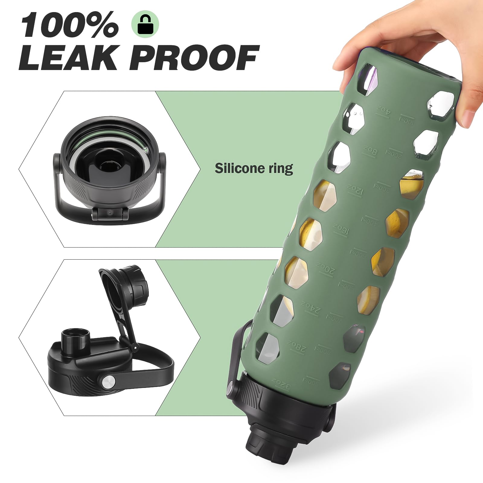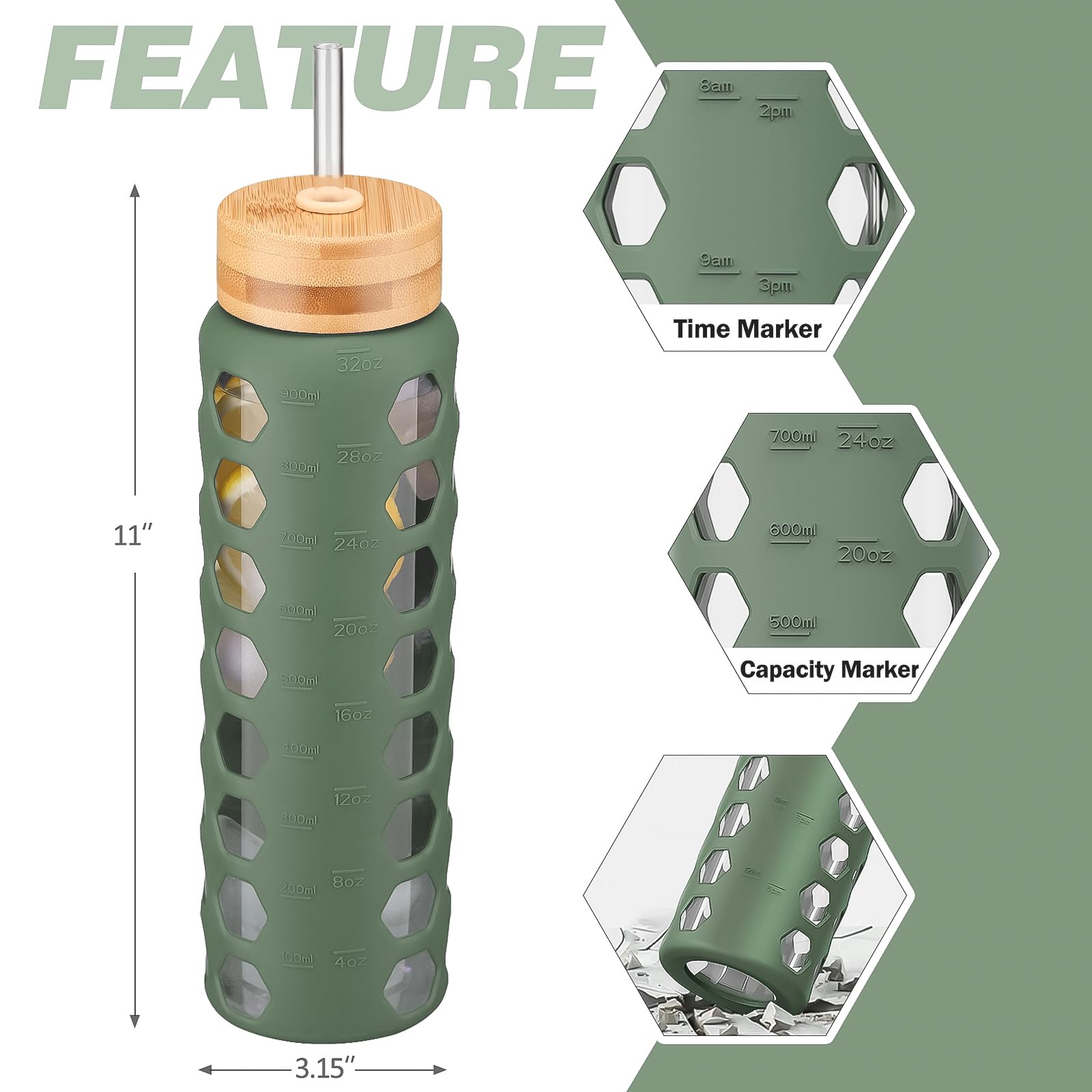 MUKOKO Glass Water Bottles, 32oz Glass Tumbler with Straw, Drinking Bottles with 2 Lids-Handle Spout Lid&Bamboo Straw Lid, Motivational Water Bottle with Time Marker and Silicone Sleeve, 1 Pack-Olive