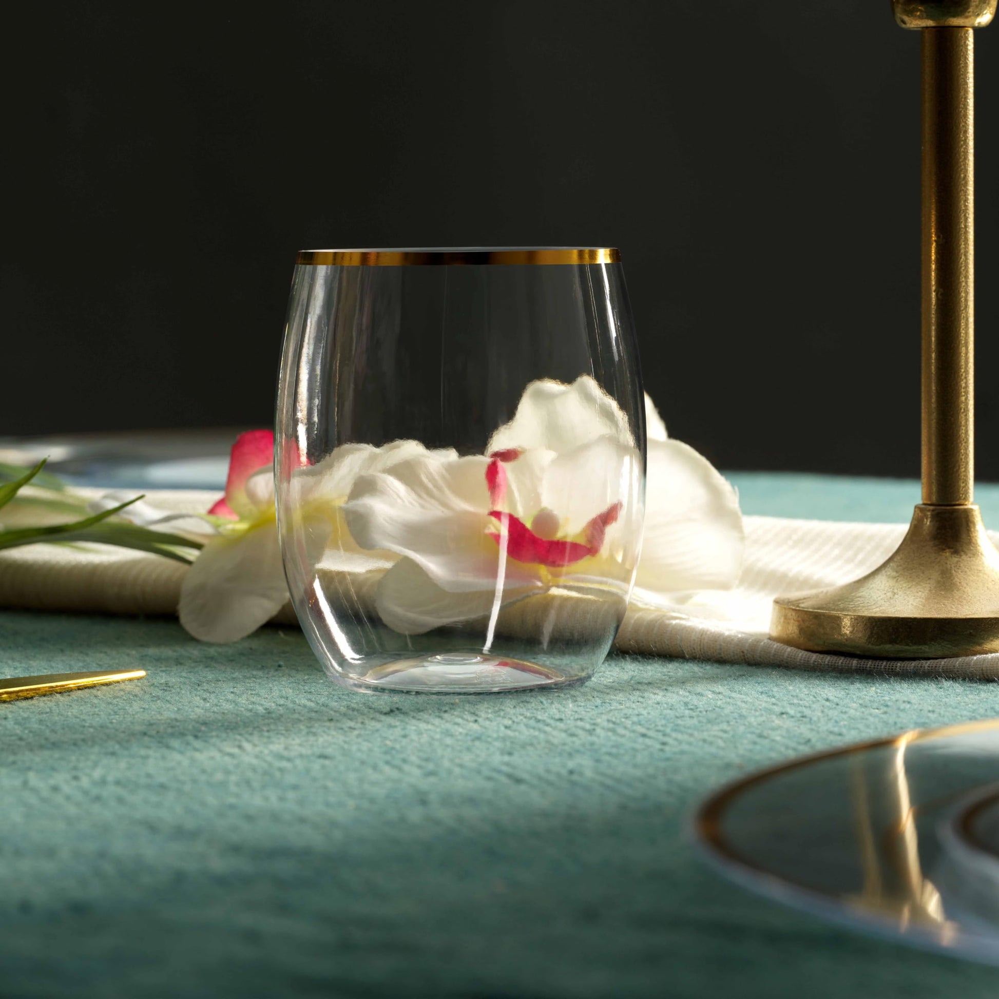 Details: Add Elegant to your party with the MUNFIX GOLD RIMMED PLASTIC STEMLESS WINE GLASSES TUMBLERS