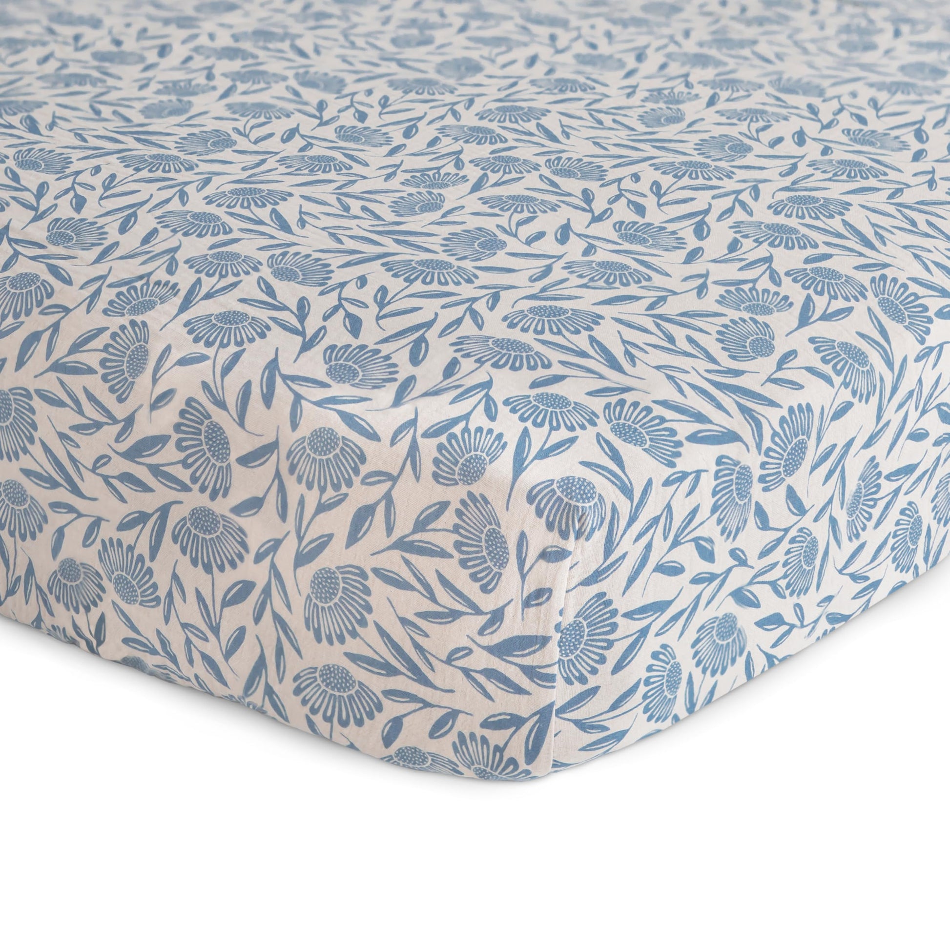 mushie Extra Soft Muslin Fitted Crib Sheet | 192 Thread Count | 28"x 52" (Blue Flowers)