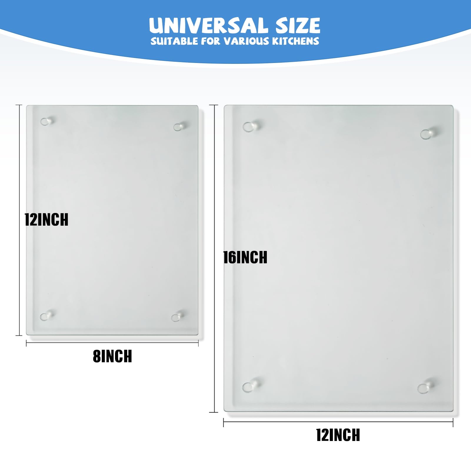 • PRODUCT FEATURES: Glass cutting board is made of tempered glass for long-lasting durability. The four edges of the product are carefully polished and very smooth and safe, 12x16" & 12x8" ,Set of 2 (Clear).