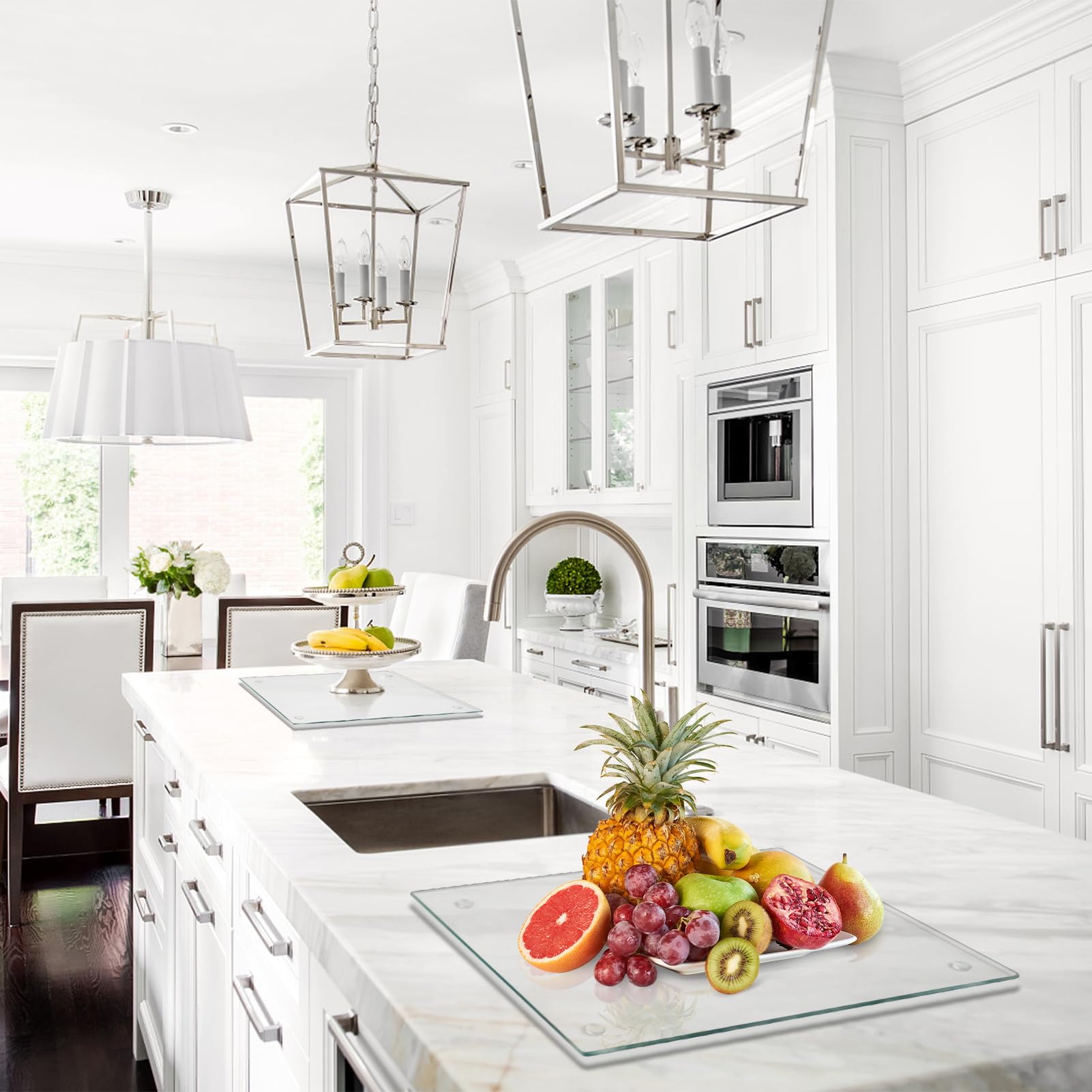 • ANTI-SLIP: There are four non-slip feet on the bottom of the glass cutting board to ensure that the board won't scratch your countertop, and it also makes the board very stable and won't slide.