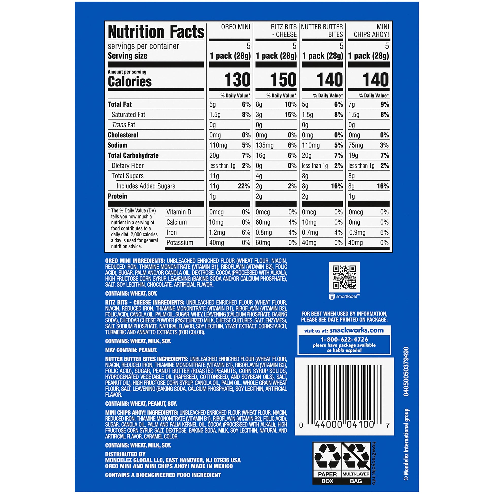 Details: This Classic Mix Variety Pack includes OREO Mini cookies, CHIPS AHOY! Mini cookies, Nutter Butter Bites and RITZ Bits Cheese for all the classic flavors you know in convenient snack-size packages. This snack variety pack offers bite-size versions of these tasty treats, perfect for filling lunchboxes or on-the-go snacking. OREO Mini cookies have the same original creme filling as their full-sized counterparts, and CHIPS AHOY! Mini cookies are packed with yummy chocolate chips for a tasty snack. RITZ Bits Cheese crackers provide a savory crunch, and Nutter Butter Bites have a smooth and delicious peanut butter flavored filling. Include these office or school lunch snacks in your lunchbox for a special treat, or keep at your desk to curb afternoon hunger. These bulk snacks include 20 individual packages for convenient storage and easy packing.