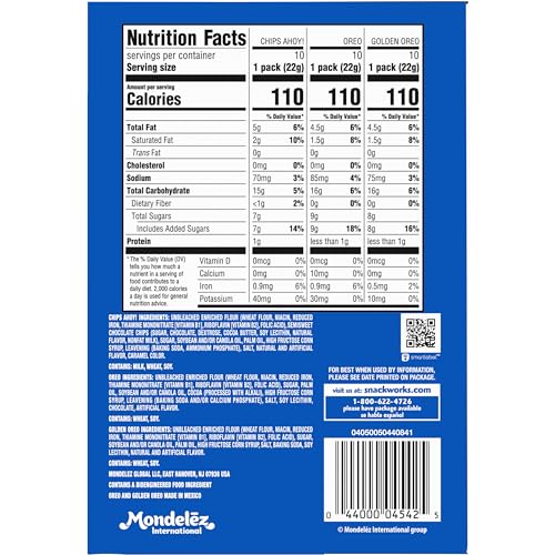 Details: This Sweet Treats Cookie Variety Pack includes OREO Original cookies, OREO Golden cookies and CHIPS AHOY! chocolate chip cookies in convenient snack packs for freshness and perfect portions. OREO cookies have the same original creme filling, and OREO Golden cookies offer a fun, vanilla take on the classic sandwich cookies. CHIPS AHOY! chocolate chip cookies are filled with crunchy goodness for a sweet treat. Tuck these snack packs into your lunch for a fun dessert, or reach for these snack size cookies when you’re ready to unwind from the day. They also make great holiday favors, stocking stuffers, Easter basket fillers, Halloween treats, school snacks, snack variety packs for adults and sweet snacks for the team after the big game. Each individually wrapped cookie pack includes two cookies, just the right amount to satisfy your sweet tooth. This cookie pack of variety snacks includes 30 individual snacks for easy storage and convenient transport.
