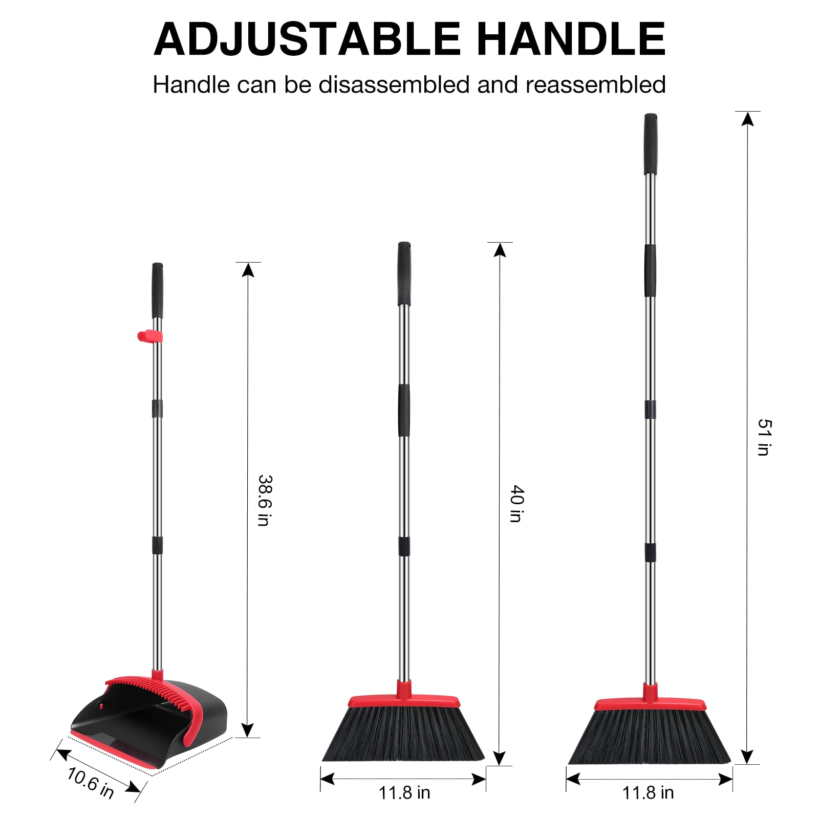 NACENA Broom and Dustpan Set, 52-in Long Adjustable Handle Broom Dustpan Combo with Dustpan Teeth to Automatically Clean Hair Suitable for Home Kitchen Office Hall Floor(Black&Red)