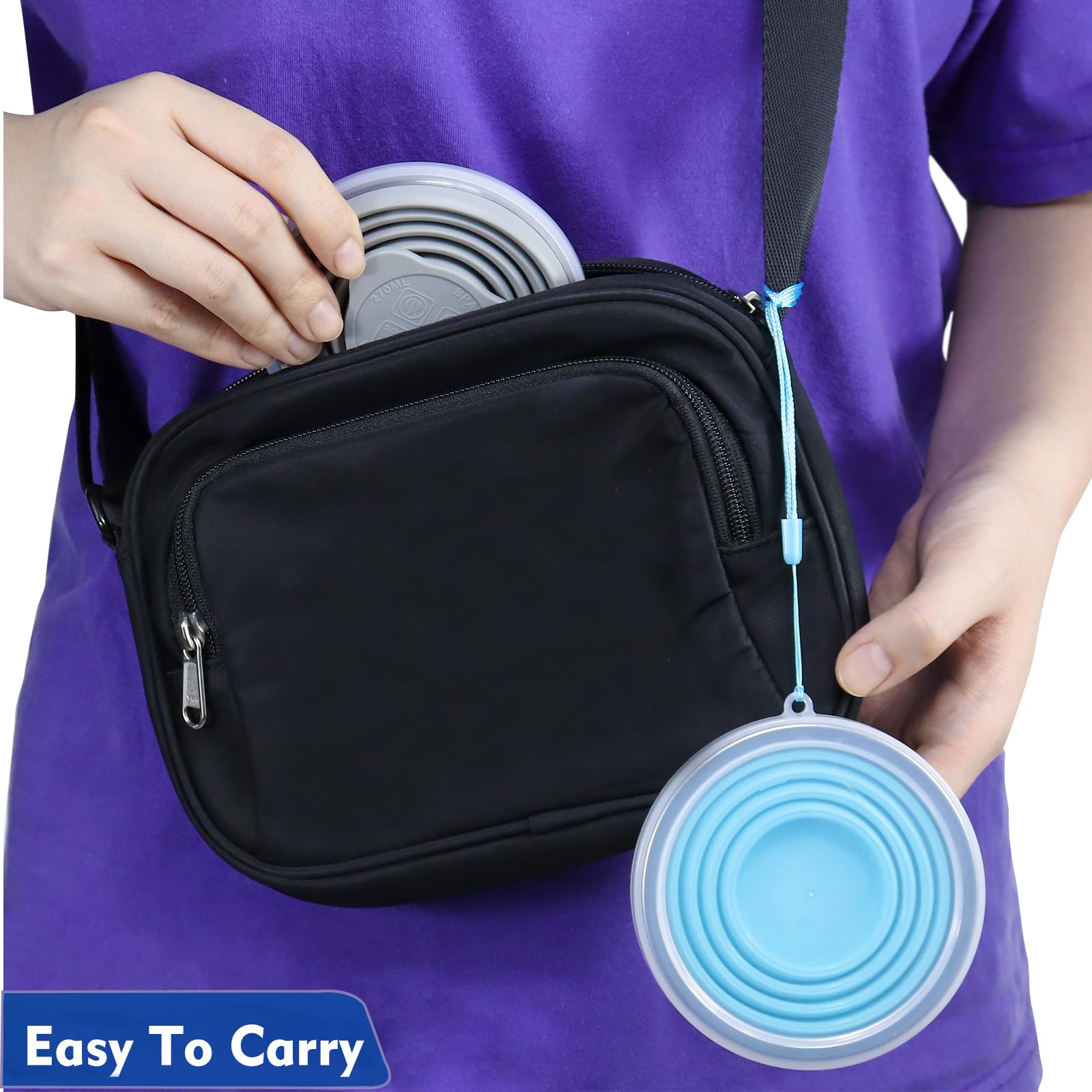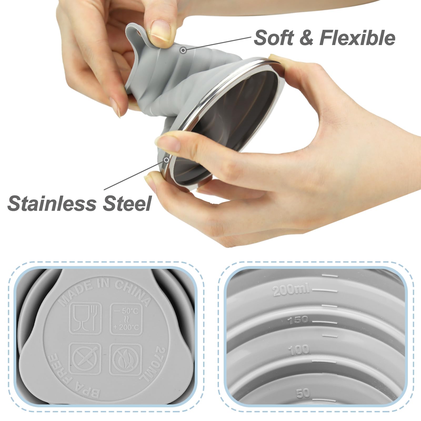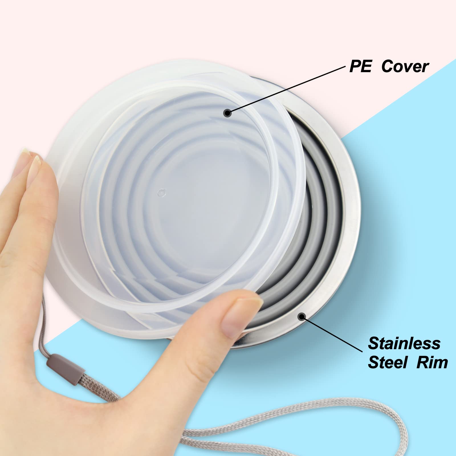 • Drinking Cup with Lid:The silicone collapsible cups have a hand strap that can be hung on the lid.The metal rim makes the cup stable and maintains its shape, making it easier to hold and drink