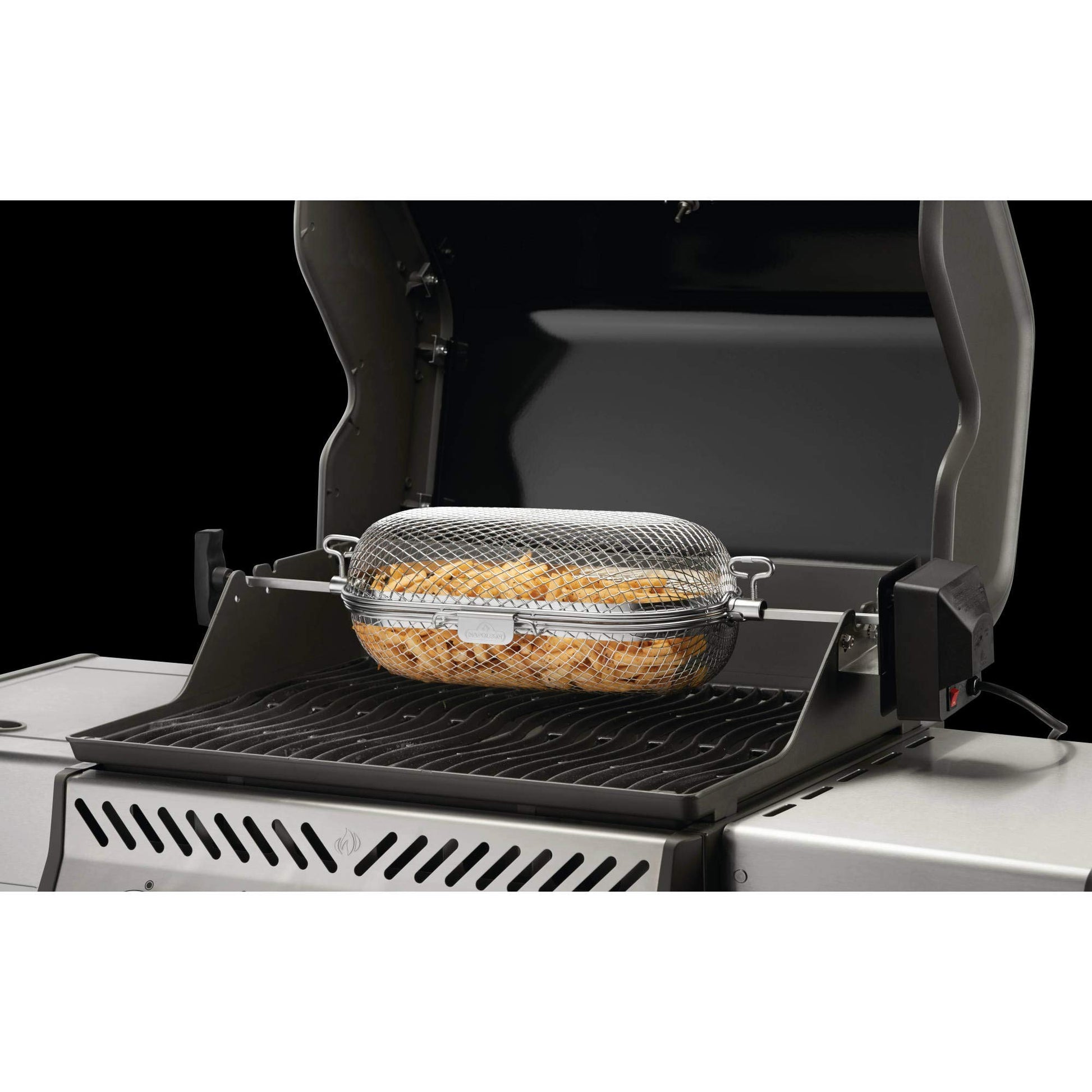 Details: Things just taste better when they're barbecued and with the Napoleon Rotisserie Basket it's easy to make wings, french fries, and so much more right on the grill. The Rotisserie Basket's rod ports fit most rotisserie rod styles and lock in place with the thumb screws. Once you've created the most delicious wings, crispiest fries, and grill roasted veggies without the addition of oil, the stainless steel baskets clean up easily, then nest for space saving storage.