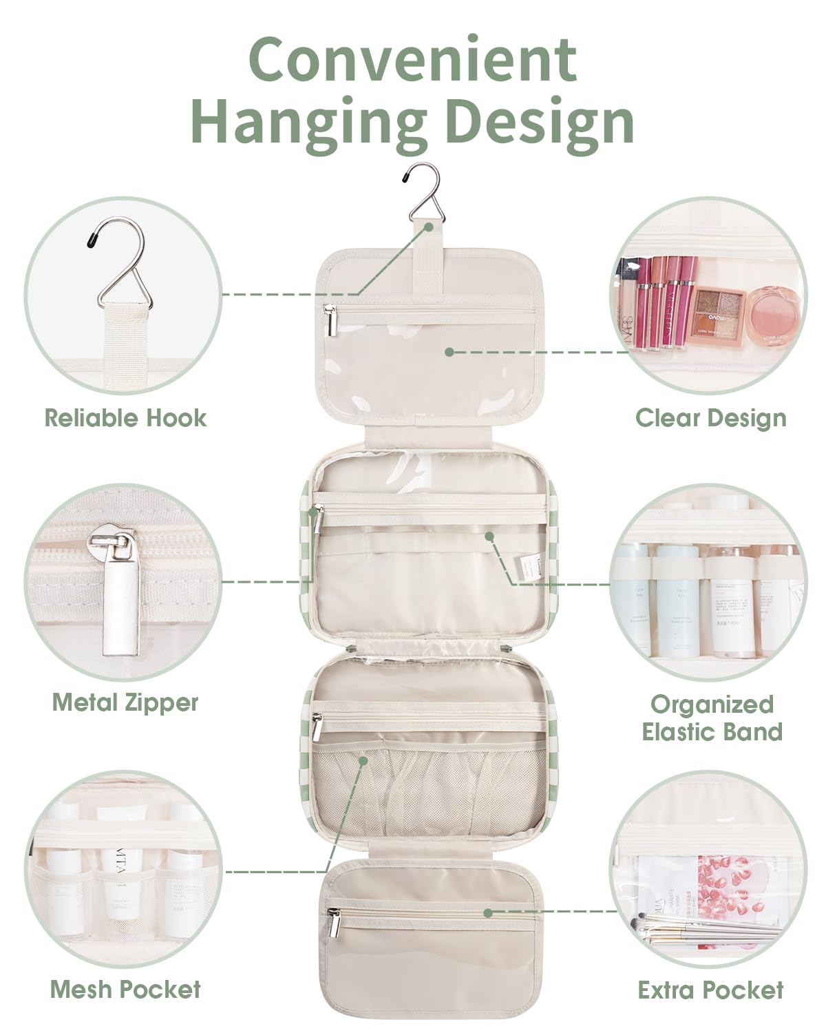 • NOT BULKY DESIGN - Large Capacity yet compact design, weighing 14 ounces. large metal hook allows hanging the toiletry case from towel rack, coat hook or whereever is available, making your toiletries and cosmetics displayed well for easy access