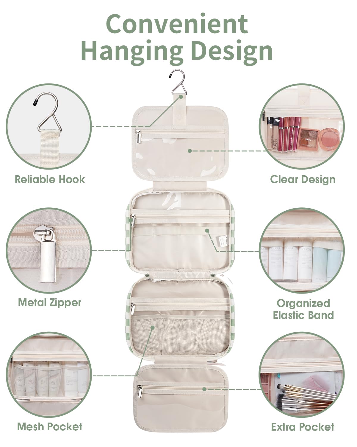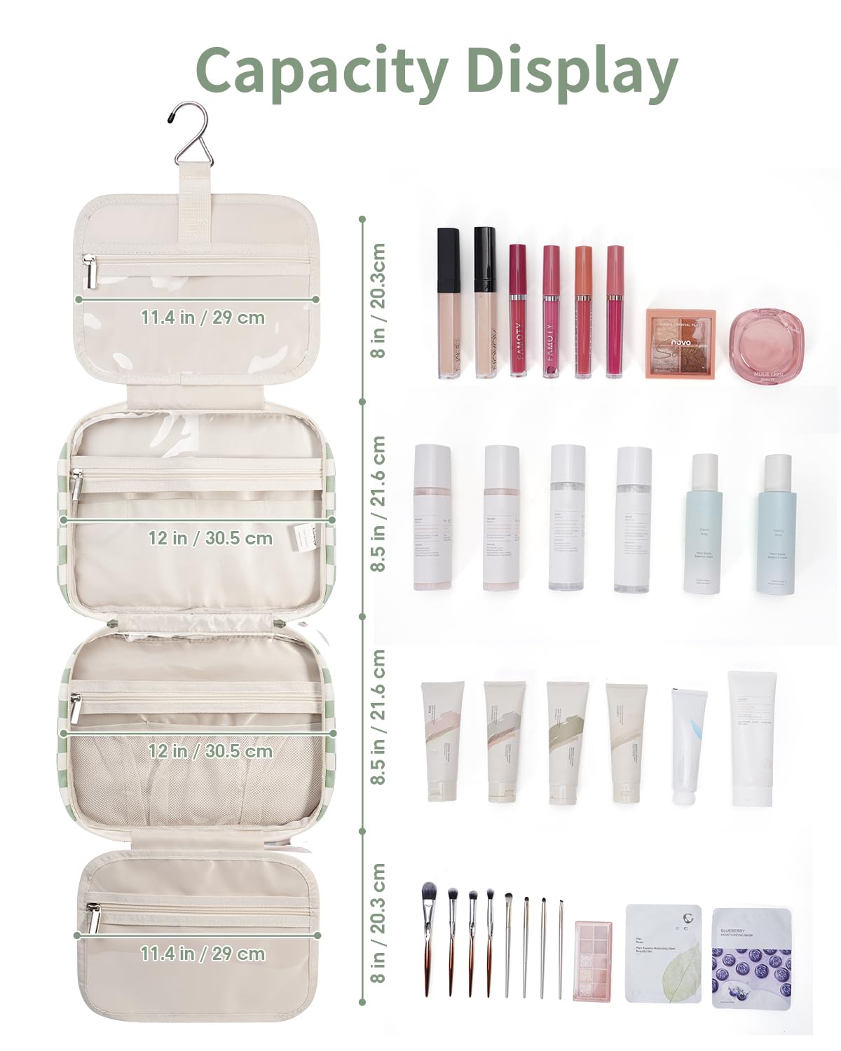 Narwey Travel Toiletry Bag for Women Large Hanging Makeup Bag Organizer Toiletries Bag for Full Size Essentials Accessories Cosmetics (Mint Green Checkerboard (Large))