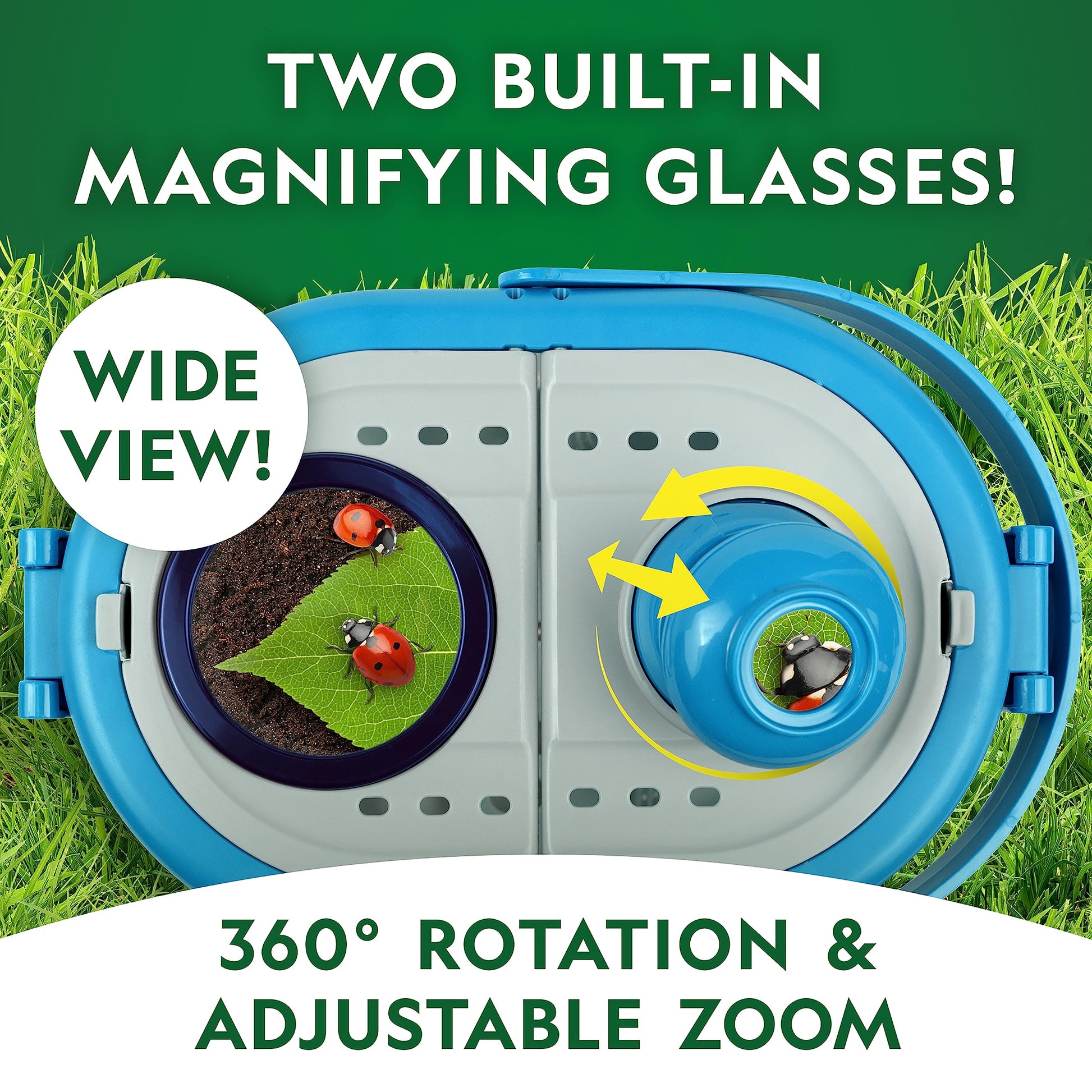 • 2 BUILT-IN MAGNIFYING GLASSES - The magnified viewers are designed to offer up-close observation of the bugs you catch. The larger, stationary magnifier lets kids see their bugs up close, while the other telescopes and moves to watch bugs in action!