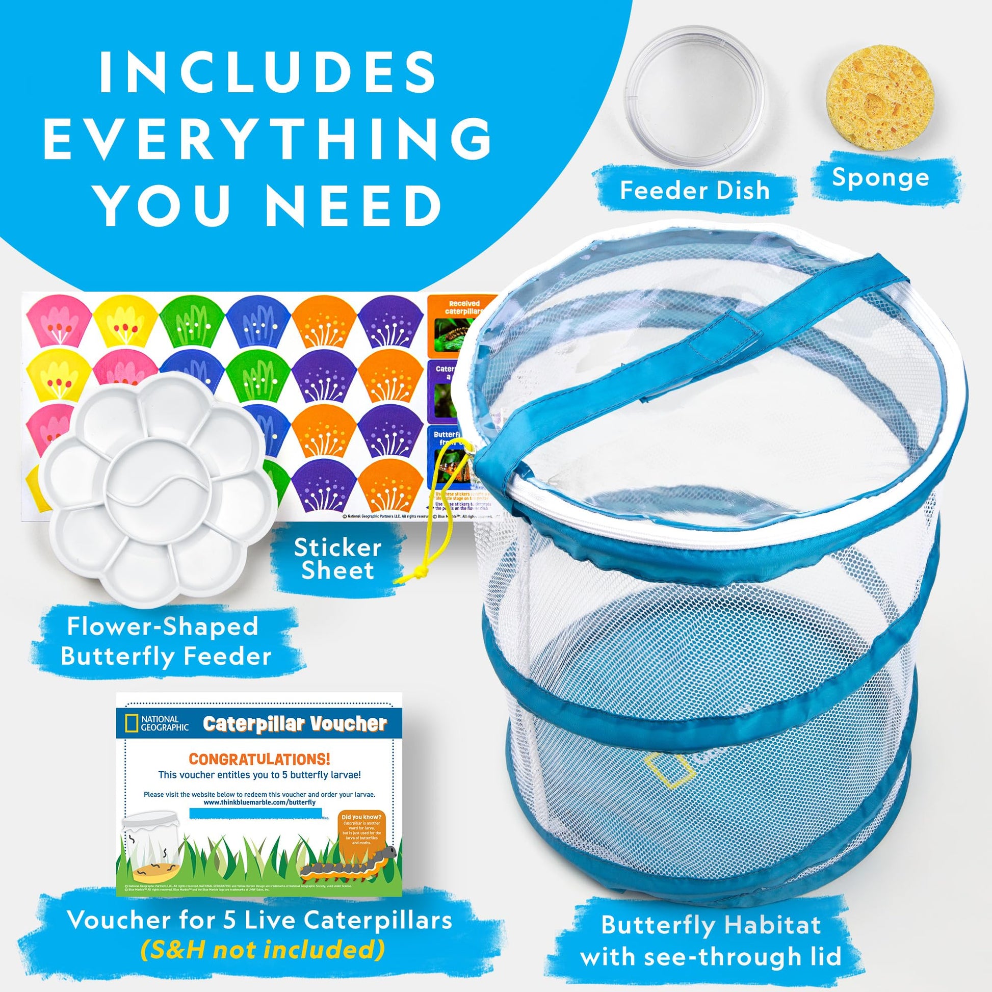 National Geographic Butterfly Growing Kit - Butterfly Habitat Kit with Voucher to Redeem 5 Caterpillars (S&H Not Included), Butterfly Cage, Feeder (Amazon Exclusive)