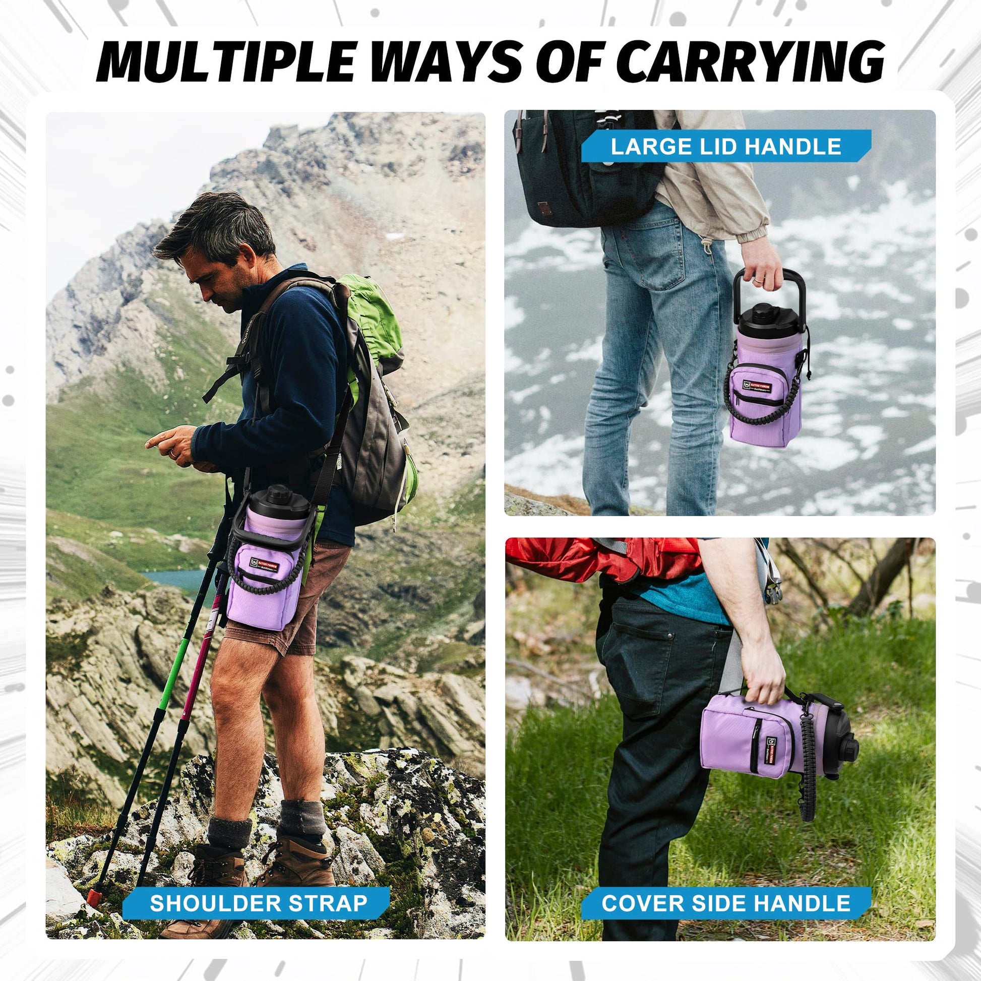 • 【Portable Water Bottle Holder】 – To make carrying easier, this 64oz water bottle comes with a handmade paracord handle and adjustable shoulder strap for hands-free convenience. The holder includes a zippered storage pocket for small items like keys, cards, or snacks, and a side hook for accessories. Whether you’re going on long hikes, outdoor adventures, or traveling, this bottle + carrier set offers both functionality and style