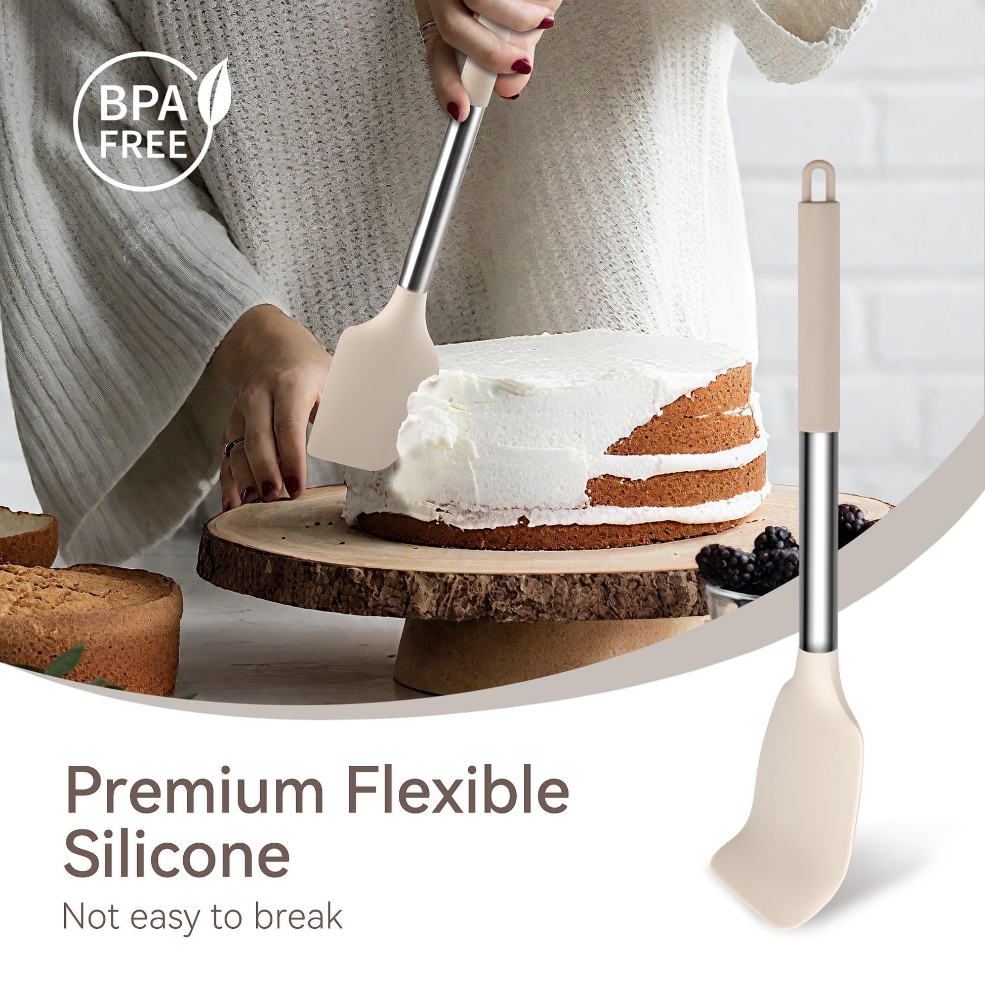 • STAINLESS STEEL AND FOOD GRADE SILICONE UTENSILS SET: The silicone head combined with the high quality stainless steel handle ensures lightweight and durable for everyday use. Designed not to bend, break or rust. Food-grade silicone head with no harsh chemical odor. Stainless steel handle to protect your hands from burns