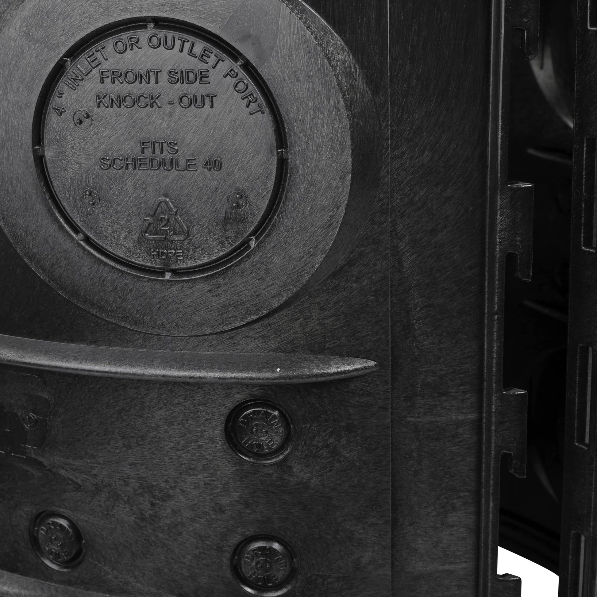 • HOW TO INSTALL: Connect to 4" Sewer and Drain (S&D) Pipe through top cover knockout; 12 side-panel knockout points connect 4" S&D and Sch 40 Pipes; Can be buried or stacked up to 8 ft deep and supports pedestrian traffic, including lawn tractors