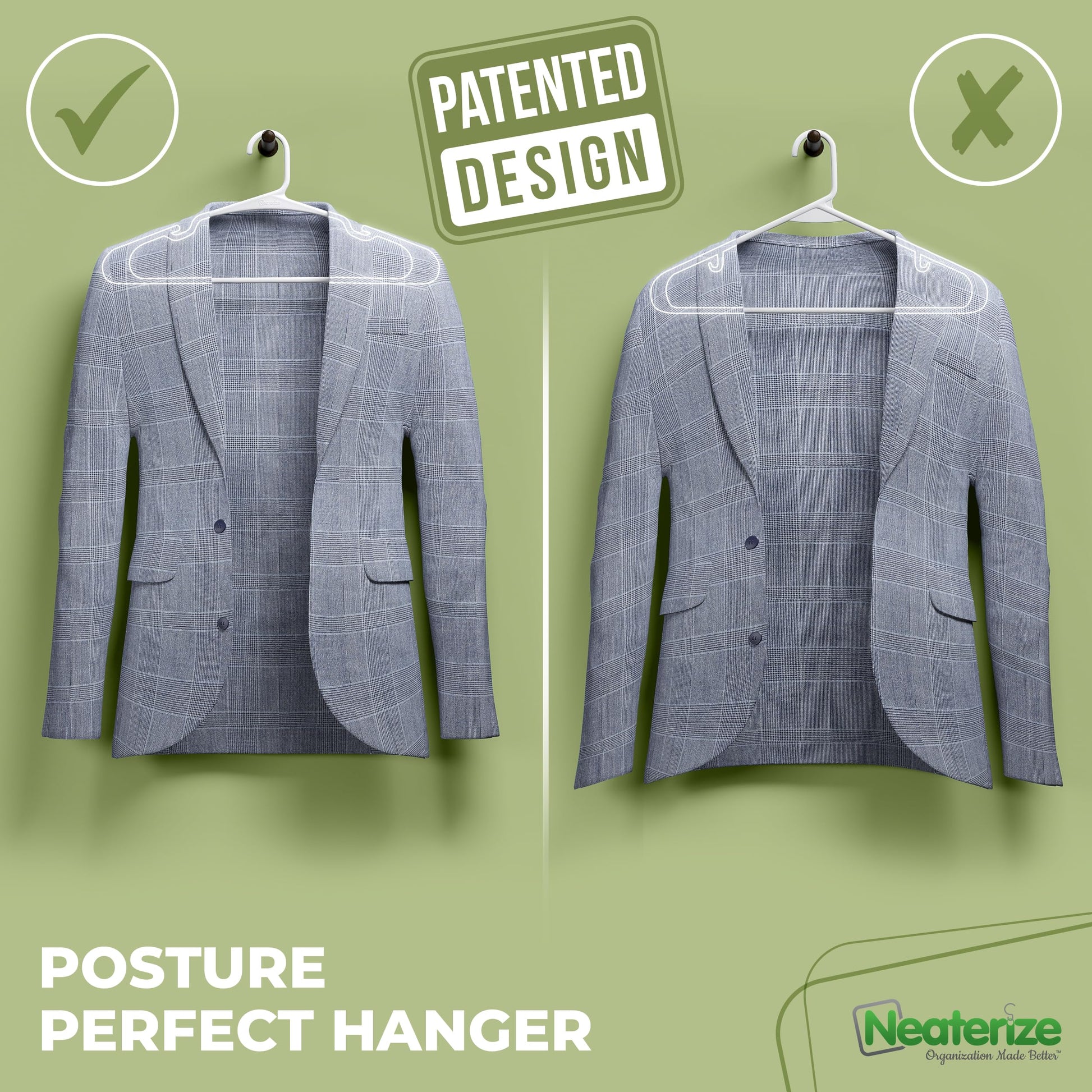 • ★ PATENT PENDING UNIQUE DESIGN: Discover the game-changing hanger shape by Neaterize, designed to prevent the dreaded slump of suits and dresses. Our patent-pending design guarantees that your clothes hang flawlessly, maintaining their pristine condition and alignment exactly as you arranged them. Plus, a clever notch caters to those sleeveless garments in your closet. Measures 15.9’’ x 7.4’’ x 0.22’’ and is available in packs of 16, 30, 50, or 100 - we mean it when we say we’ve got you covered!