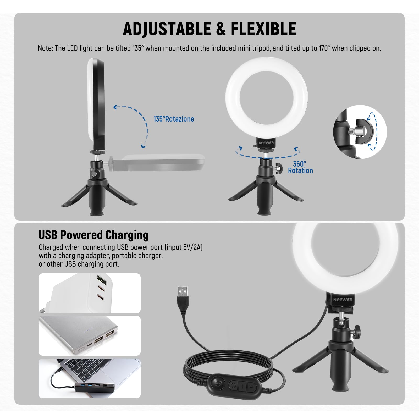• 【USB Powered Charging】 The 10W LED ring light operates at 5V/2A, with a built in 6ft/1.8m charging cable, and can be powered via gears with USB ports such as displays, laptops, mobile power supplies equipment, or phone chargers, providing energy efficient and environmentally friendly photography or daily lighting solutions. Note: Mount the clip with a hole on the camera side to avoid obstructing the lens