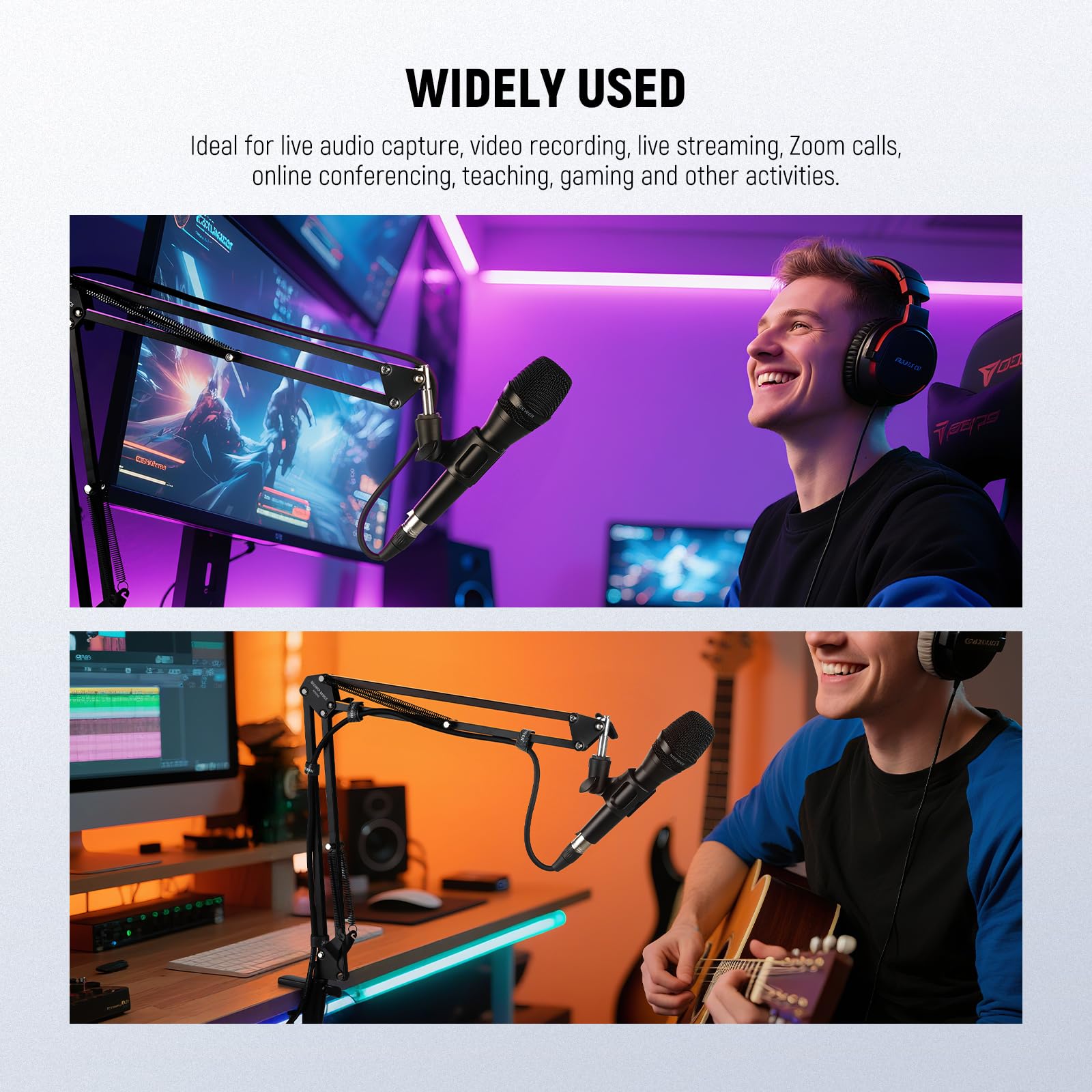 • 【Microphone Arm Desk Mount】 The mic stand equipment features a two section boom arm, a desk mounting clamp, and a mic clip, allowing for easy, flexible, and quiet positioning of your microphone during live audio capture, studio podcast, vlogging, video recording, live streaming, Zoom calls, online conferences, teaching, gaming, singing, podcasting setup etc. The foldable design offers adjustable height and angle for optimal positioning while remaining compact for easy storage and portability