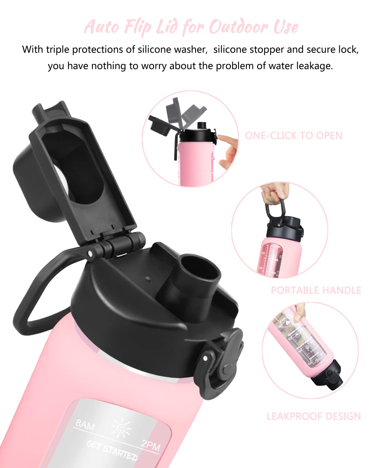 • EQUIPPED WITH 2 LIDS FOR DIFFERENT USE: Our borosilicate glass water bottle are equipped with a natural bamboo lid , and an auto flip lid with handle. You can use the bamboo lid indoor such as office, school and home. The leak proof auto flip lid can be used outdoor such as driving, traveling and fitness. It has a secure lock, making it dust-proof and leak-proof. You can simply open it with one hand by pressing the button after unlocked.