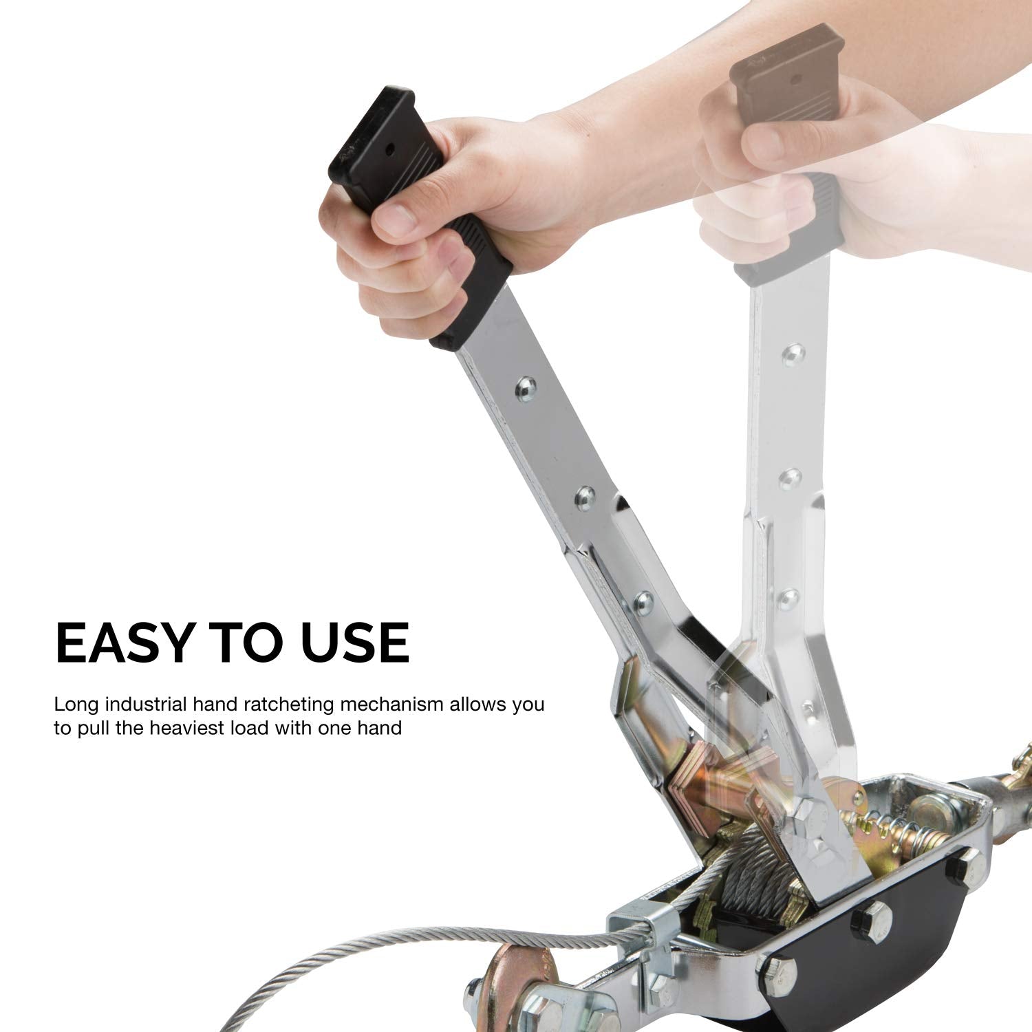 • LEVER ARM: Includes long industrial hand ratchet handle with PVC coated grip for leverage and 3 latching hooks for added safety and versatility when going off road vehicle recovery, pulling fences, logs, stumps, or rocks.