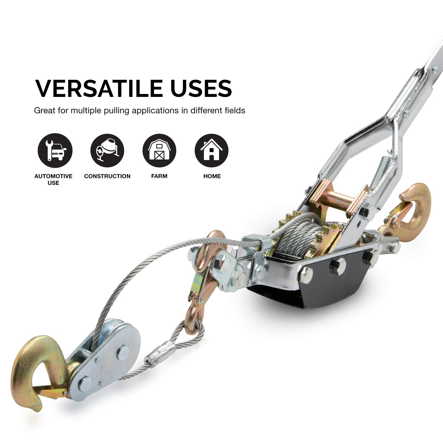 Details: NEIKO presents the 02256A Heavy Duty Manual Come Along Cable Puller. This comealong manual winch is capable of pulling ten thousand pounds. Convenient and portable enough to use in almost every situation, small enough to carry with one hand and light weight so you can fit it in your trunk. Pull large loads and vehicles of whatever you are stuck in. You can also use them for stretching fences, lifting objects, and lowering objects. Some more advanced uses are also pulling joints together, pulling frame of a new construction together during its raising, or straightening heavy panels while putting them in place. Works in the industrial and construction fields, on boats and ships. With its long hand operated ratchet lever winch gets all the leverage you need.