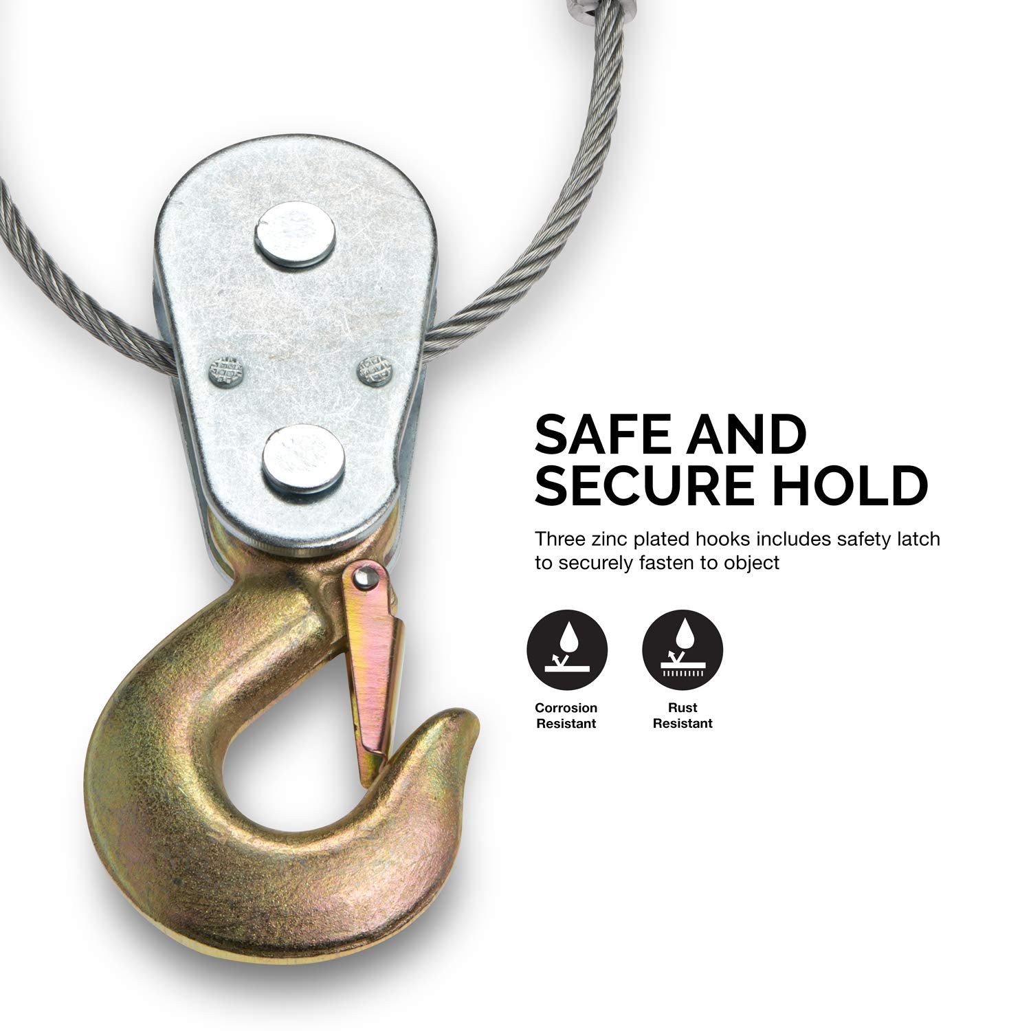 • WINCH HOOK: Heavy duty puller steel construction for added durability; hooks and gears are zinc plated for a long-lasting life in your garage or workshop when pulling, dragging, lifting, or stretching. Safety latch on all hooks to prevent accidents or slipping off.