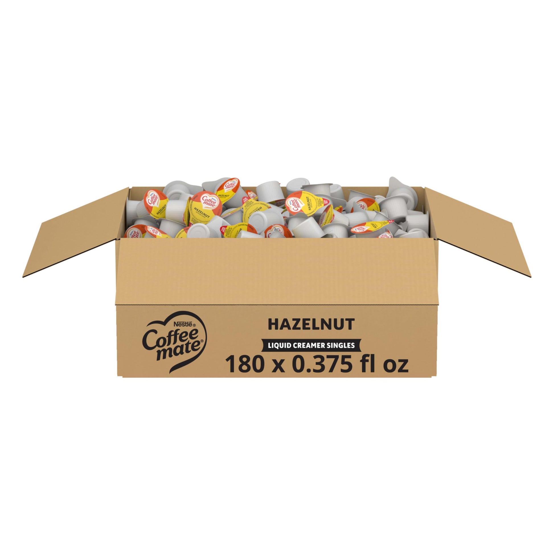 Details: Nestle Coffee mate Hazelnut flavored liquid creamer singles are a crowd pleaser. Within each cup is a harmonious blend between a deliciously rich, velvety smooth classic and sweet nutty hazelnut notes that will enhance and enrich your coffee offer with a touch of differentiation. Packaged in a 180 count box, these are the perfect solution for a delicious and convenient option to customize your favorite beverage. These creamer singles don’t need to be refrigerated, and can retain their irresistible flavor at room temperature for up to 9 months. Easy to use - shake, open and pour. Non-Dairy + Lactose-Free + Cholesterol-Free + Gluten-Free + Kosher Dairy. Coffee mate is America's #1 coffee creamer. With a variety of flavors and formats, Coffee mate has your coffee creamer needs covered. Delight your employees, customers and guests by offering Coffee mate liquid creamer in your workplace, break room or kitchen. Covered by the Nestlé Professional 60-Day Satisfaction Guarantee for Select Products. See below for details.
